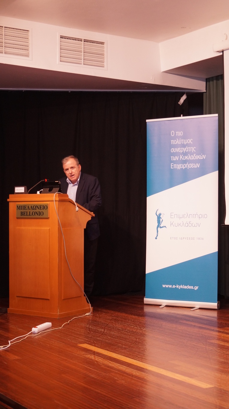 Ενημέρωσε πως σε Θήρα και Θηρασιά λειτουργούν 4.500 επιχειρήσεις απασχολώντας περί τους 22.000 εργαζόμενους, ενώ επεσήμανε ότι η τοπική επιχειρηματικότητα ενισχύεται σε μεγάλο βαθμό από τους επισκέπτες της κρουαζιέρας, εκφράζοντας παράλληλα την αγωνία του για την υφιστάμενη κατάσταση και επισημαίνοντας τις τοπικές ιδιαιτερότητες της κρουαζιέρας και διατυπώνοντας την ανάγκη αύξησης του βαθμού απόδοσης της κρουαζιέρας προς όφελος των επιχειρηματιών της Σαντορίνης.