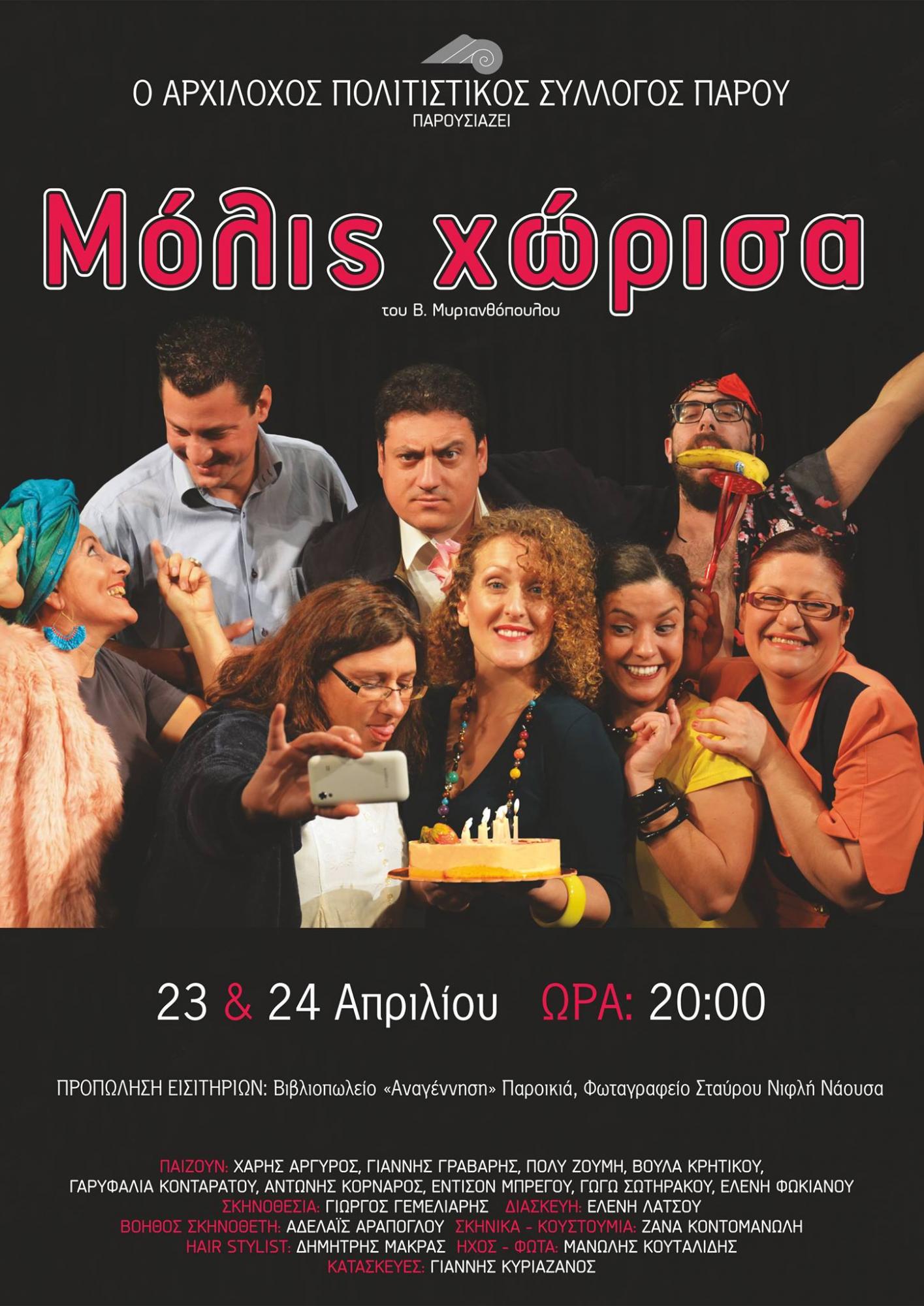 Η Θεατρική ομάδα του Πολιτιστικού Συλλόγου Πάρου «Αρχίλοχος» θα παρουσιάσει την κωμωδία βασισμένη στο θεατρικό έργο του Βασίλη Μυριανθόπουλου «Μόλις Χώρισα».