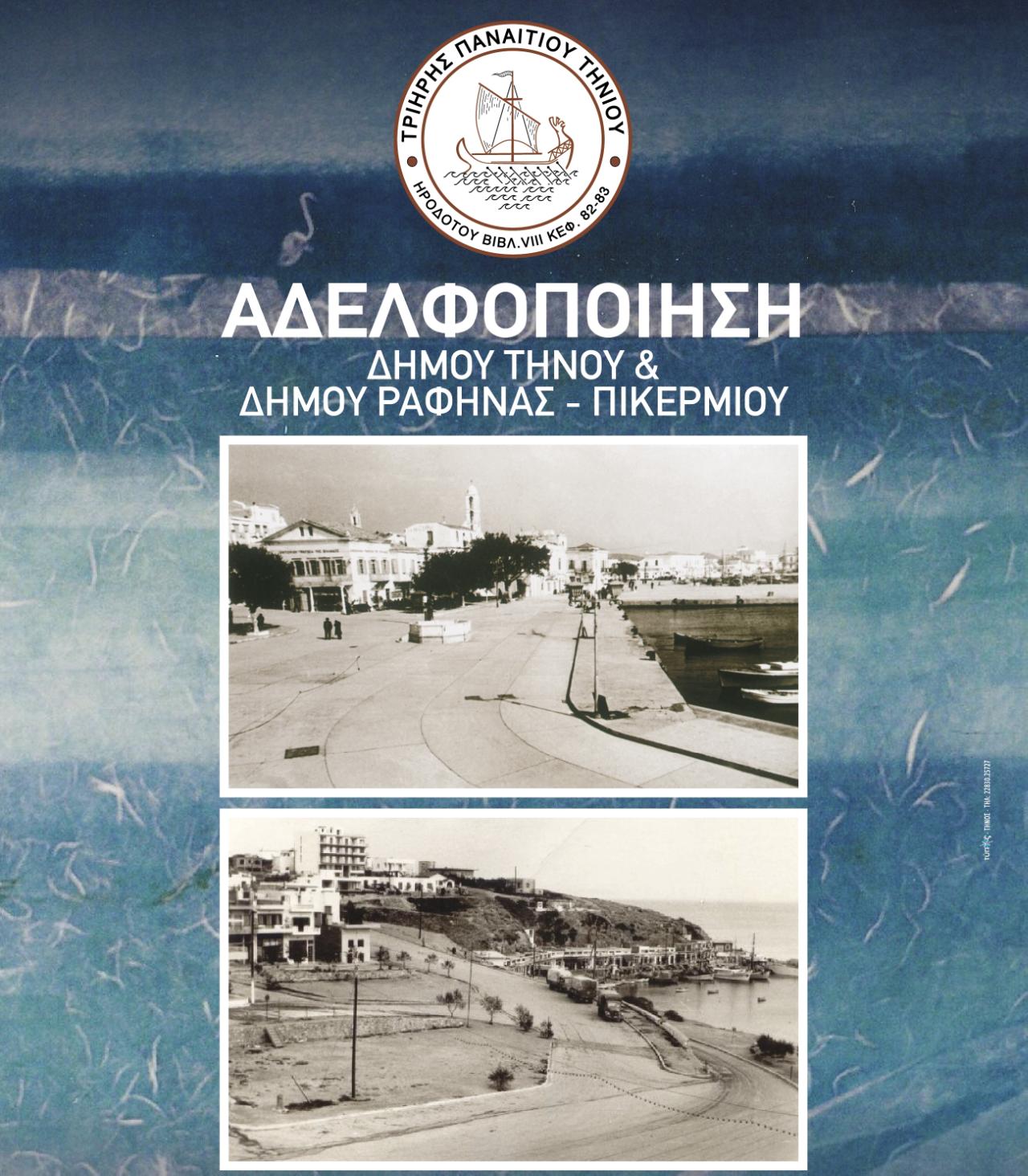 Πρόκειται για τους Δήμους Τήνου και Ραφήνας-Πικερμίου τα δημοτικά συμβούλια των οποίων αποφάσισαν ομόφωνα να αδελφοποιηθούν, με σκοπό τη σύσφιξη και παραπέρα ανάπτυξη δεσμών φιλίας μεταξύ τους, την προώθηση πολιτιστικών και κοινωνικών σχέσεων, την ανταλλαγή μορφωτικών, πολιτισμικών και τουριστικών στοιχείων και τη συνεργασία σε οικονομικό, κοινωνικό, πνευματικό και πολιτιστικό επίπεδο.