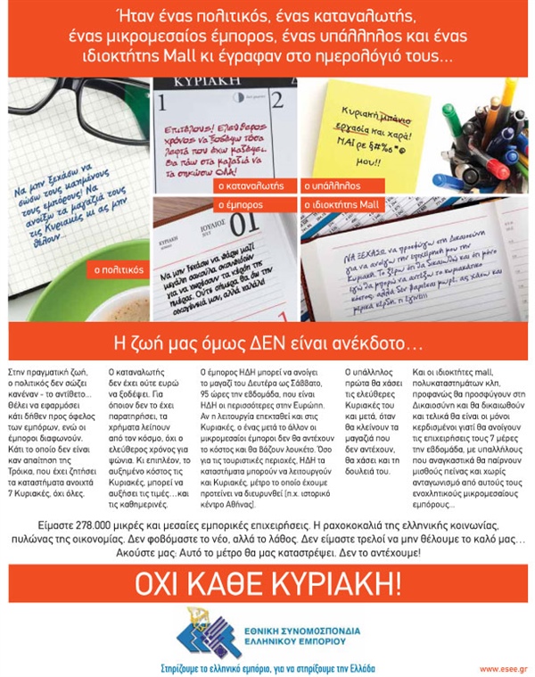 Πάντως, η Εθνική Συνομοσπονδία Ελληνικού Εμπορίου (ΕΣΕΕ), που βρίσκεται σε «μετωπική» με το Υπουργείο, διαμηνύοντας, μάλιστα, ότι αν το μέτρο εφαρμοστεί «η Κυριακή από ημέρα αργίας θα καθιερωθεί ως ημέρα απεργίας», ανακοίνωσε τη Δευτέρα ότι συμμετέχει ενεργά στη βρετανικής έμπνευσης καμπάνια «Keep SUNDAY Special» (KSS), που στόχο έχει να προβάλει σοβαρές αντιρρήσεις για την απορρύθμιση της Κυριακής. Η εκστρατεία συγκεντρώνει υποστήριξη από την Εκκλησία, φορείς και συλλόγους, οργανώσεις, μεμονωμένους λιανεμπόρους, σημαντικές προσωπικότητες, διάφορες κοινωνικές και καταναλωτικές οργανώσεις καθώς και απλούς πολίτες.