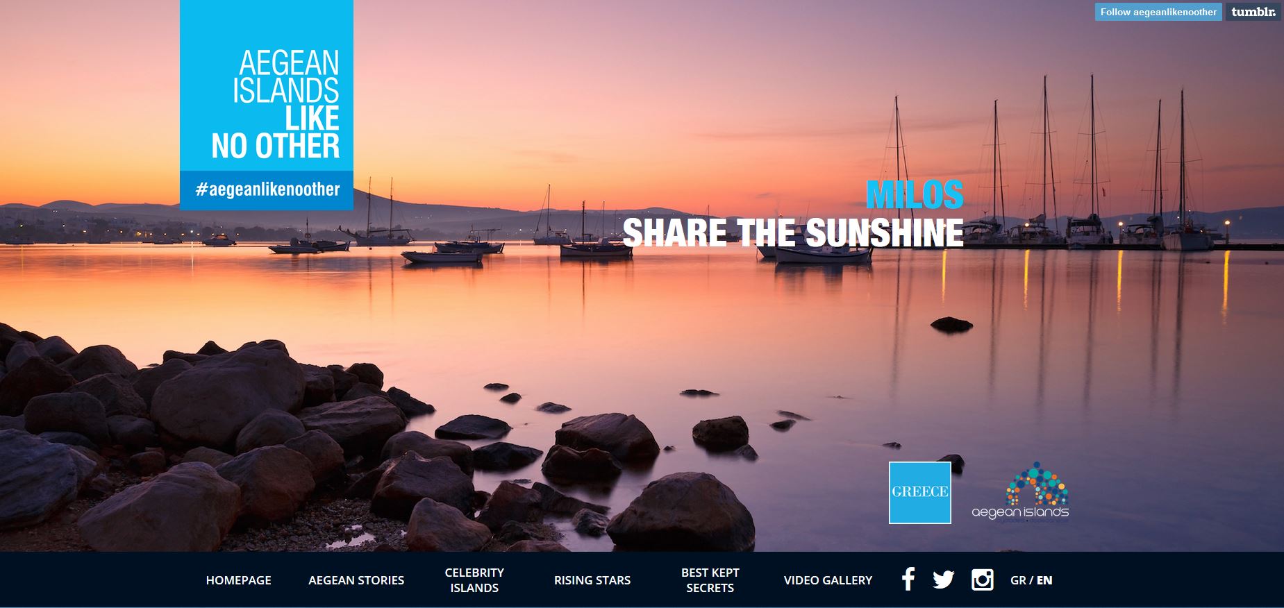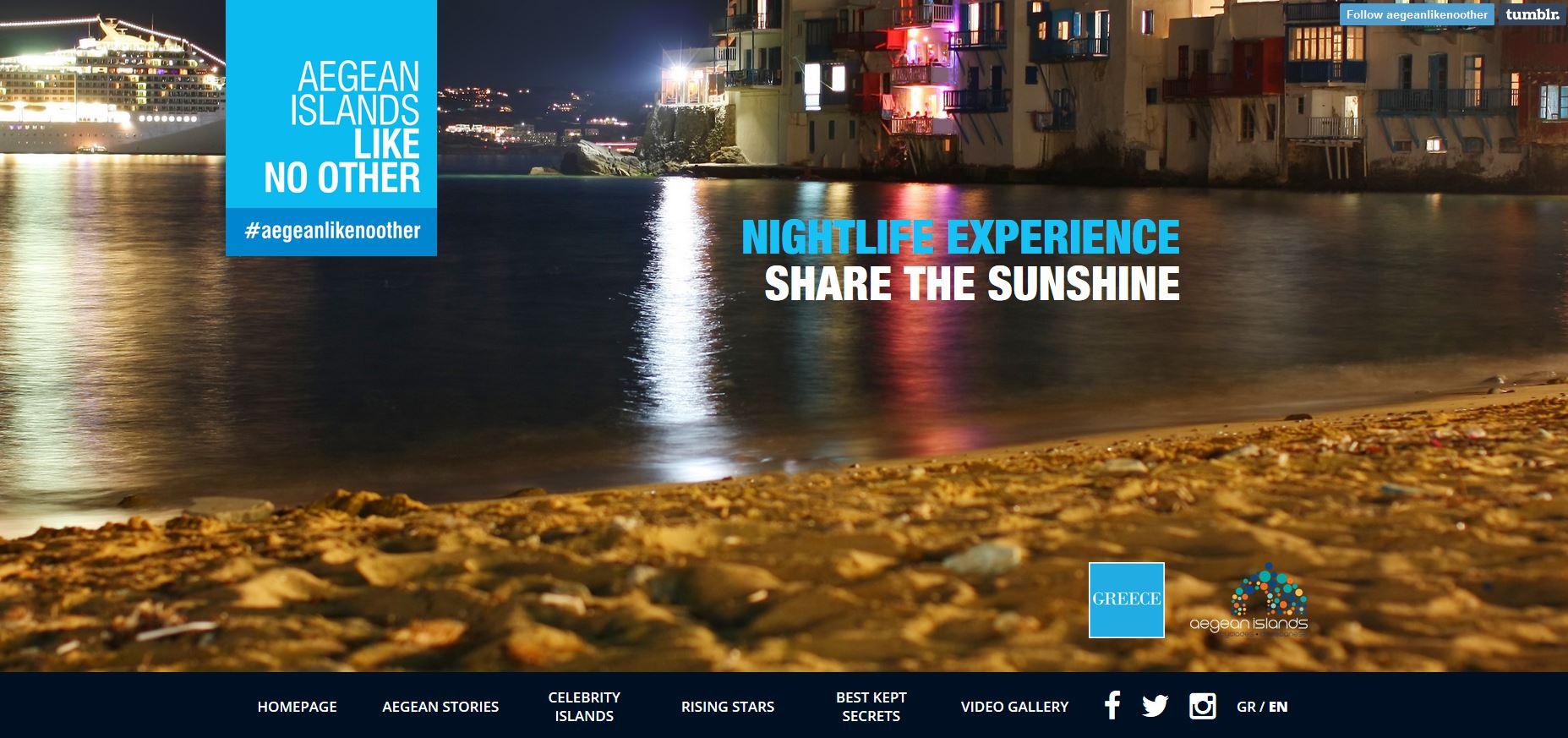Επιπλέον, παρουσιάστηκε το campaigntumblrsite http://likenoother.aegeanislands.gr/, ένα σύγχρονο εργαλείο κοινωνικής δικτύωσης και ψηφιακής παρουσίας, όπου παρουσιάζονται περισσότερο από 40 θεματικές ιστορίες των νησιών της Περιφέρειας Νοτίου Αιγαίου. Μέσα από ειδικές σελίδες για κάθε νησί και με feedχρηστών το οποίο θα αντλείται μέσα από το hashtag #aegeanlikenoother, θα αποτελέσει τον πυρήνα της φιλοξενίας και προώθησης του concept και του περιεχομένου της καμπάνιας. Το campaignsite θα συνεχίσει να τροφοδοτείται καθ’ όλη τη διάρκεια της καμπάνιας από την Περιφέρεια Νοτίου Αιγαίου και τους χρήστες.