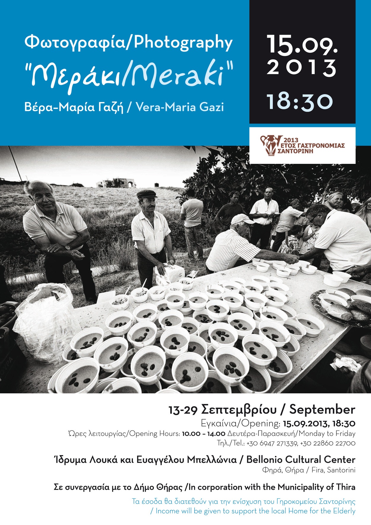 Η έκθεση φωτογραφίας της Βέρας – Μαρίας Γαζή με τίτλο “Μεράκι” θα φιλοξενηθεί από 13-29 Σεπτεμβρίου στο Μπελλώνειο Πολιτιστικό Κέντρο στα Φηρά Θήρας. Η έκθεση διοργανώνεται στο πλαίσιο της πρωτοβουλίας “2013 Έτος Γαστρονομίας στη Σαντορίνη”, σε συνεργασία με το Δήμο Θήρας, ενώ τα εγκαίνια θα πραγματοποιηθούν την Κυριακή 15 Σεπτεμβρίου 2013. Η βραδιά θα κλείσει με γευστικά παραδοσιακά εδέσματα και σαντορινιό οίνο.