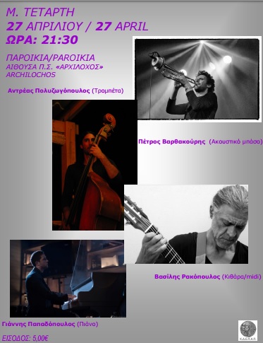 Τον Αντρέα Πολυζωγόπουλο (τρομπέτα), τον Βασίλη Ρακόπουλο (κιθάρα/midi), τον Γιάννη Παπαδόπουλο (πιάνο) και τον Πέτρο Βαρθακούρη (ακουστικό μπάσο) θα υποδεχτεί τη Μεγάλη Τετάρτη ο «Αρχίλοχος» σε μια ιδιαίτερη μουσική βραδιά, που μέσα στη θρησκευτικότητα των ημερών επιχειρεί να προβάλει τη μαγεία της διαδραστικής λειτουργίας ενός σύγχρονου αυτοσχεδιαστικού συνόλου.