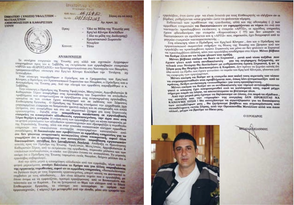 Συγκεκριμένα αναφέρει ότι “η απασχόληση αλλοδαπών από τον εργολάβο, πέρα από τα φθηνά μεροκάματα, ανοίγει διάπλατα το δρόμο και για άλλες παραβιάσεις της εργατικής νομοθεσίας, αφού αν οι αρμόδιες υπηρεσίες “δυσκολεύονται” να βγάλουν άκρη με τους Συριανούς εργατοτεχνίτες, μπορεί κανείς να φανταστεί τι συμβαίνει με τους αλλοδαπούς. Δεν είναι τυχαίο άλλωστε που ο εργολάβος με όποιο όνομα και να εμφανίζεται, προτιμά εργαζόμενους από το Βουκουρέστι και τελευταία από το Καράτσι. Για να ξεπεραστεί το θέμα τον ελέγχων από το Σώμα Επιθεωρητών Εργασίας, το σύστημα που καταγράφει το ωράριο των εργατοτεχνιτών, (κάρτες) έχει μεταφερθεί από την είσοδο, μέσα στο γραφείο του εργολάβου, έτσι ώστε να μην είναι δυνατόν για τους Επιθεωρητές να ελέγξουν αν οι βάρδιες ρυθμίζονται “στα χαρτιά” ώστε να φαίνονται νόμιμες”.