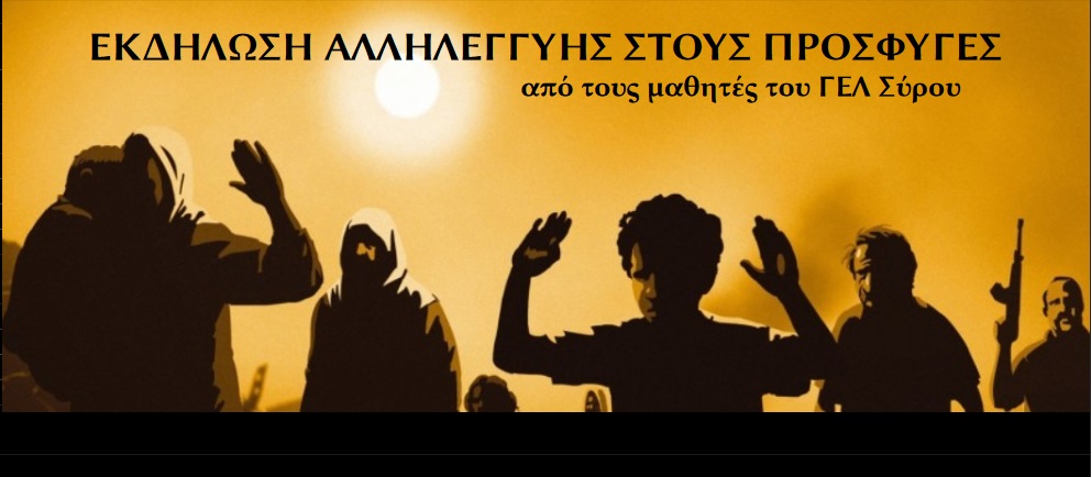 Το ΓΕΛ Σύρου προσκαλεί όλους στην εκδήλωση αλληλεγγύης στους πρόσφυγες που διοργανώνουν οι μαθητές του. Η εκδήλωση θα πραγματοποιηθεί την Τετάρτη 4 Μαΐου 2016 στις 18:00 στο σχολικό συγκρότημα Μάννα στην αίθουσα “Κωνσταντίνος Τουλούπης”.