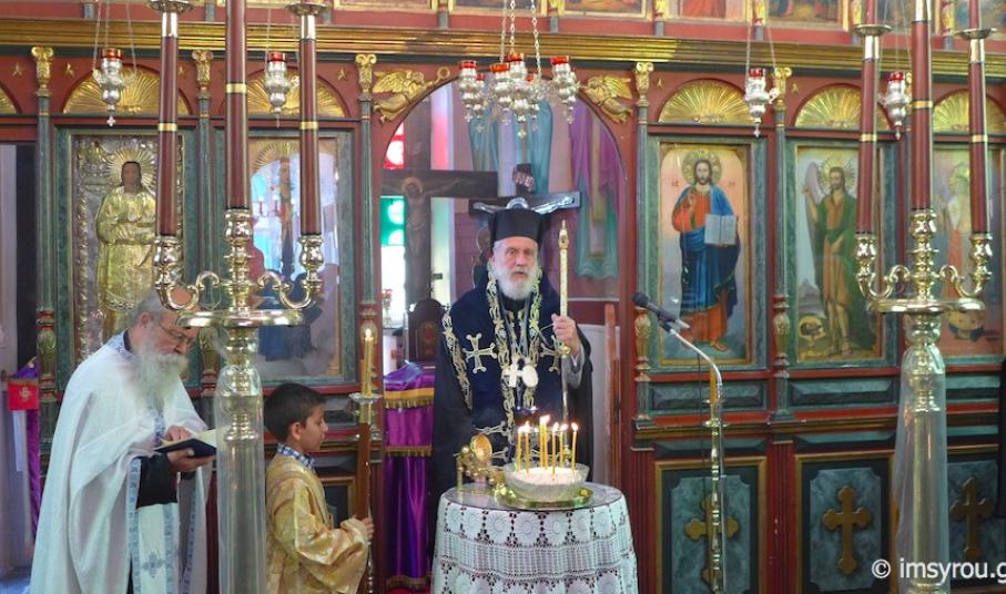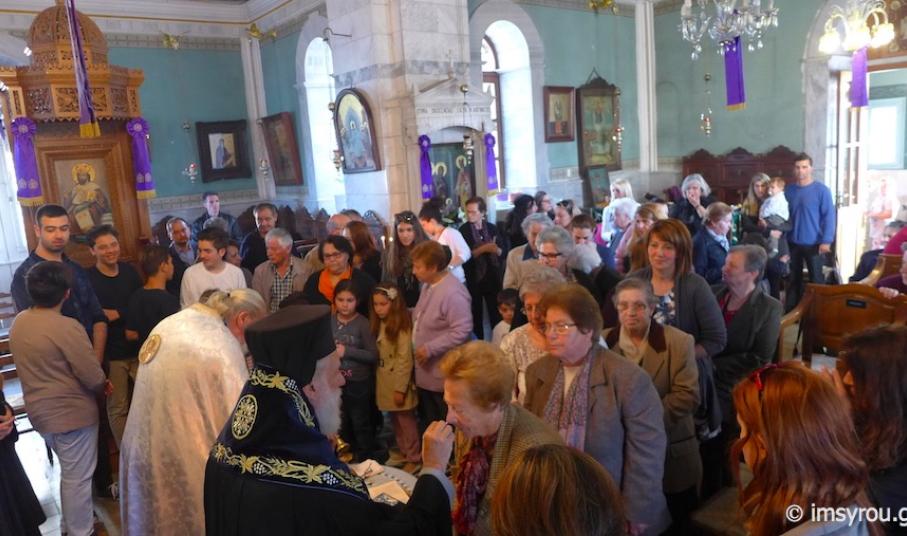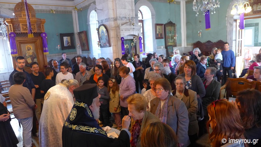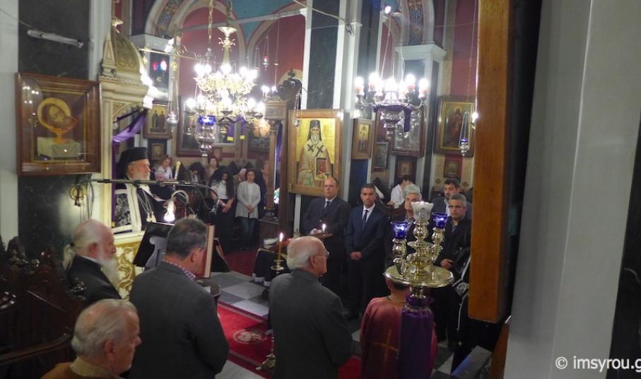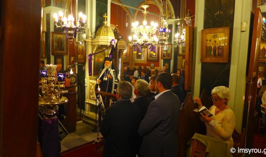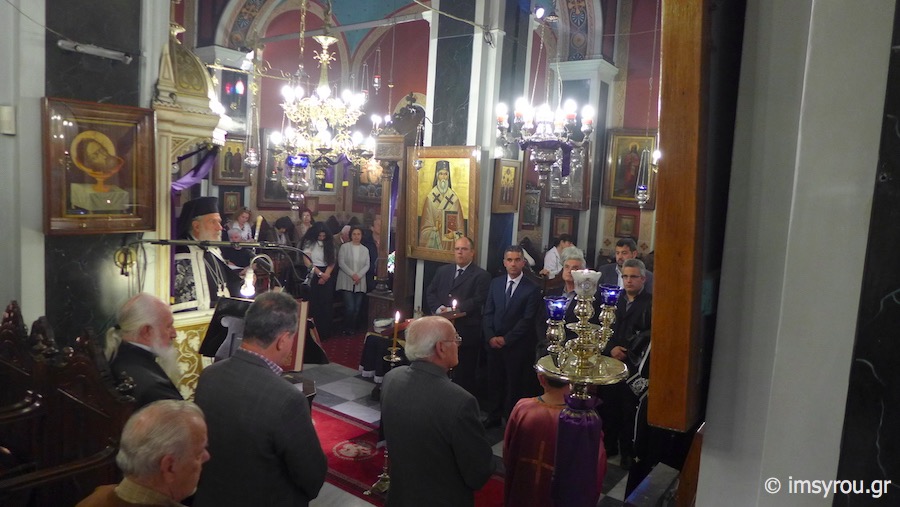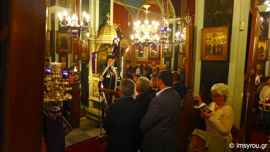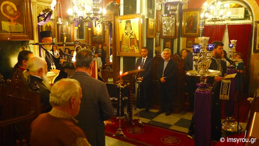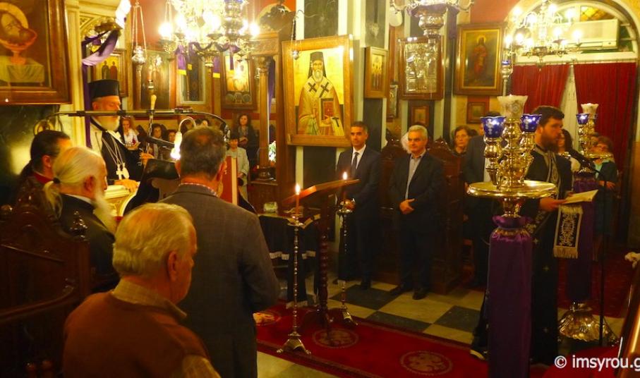 Στη συνέχεια, τέλεσε την Ακολουθία του Νιπτήρος στον Ιερό Ναό Αγίου Ιωάννου Ποσειδωνίας, όπου, μεταξύ των εκκλησιασθέντων, παρίσταντο ο Δήμαρχος Σύρου-Ερμούπολης Γιώργος Μαραγκός, ο Αντιδήμαρχος Αλέξης Αθανασίου, ο Πρόεδρος της Τοπικής Κοινότητος Ποσειδωνίας Δημήτρης Νταλαχάνης και Δημοτικοί Σύμβουλοι.