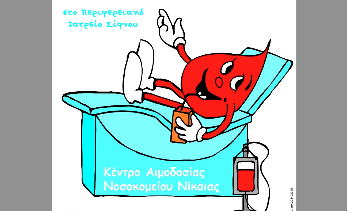 Ο Πολιτιστικός Σύλλογος Σίφνου και το Κέντρο Αιμοδοσίας, σε συνεργασία με το ιατρείο, καλούν τους δημότες από 17 έως 65 ετών να γίνουν μέτοχοι της Τράπεζας Αίματος Σίφνου, της χαράς και ικανοποίησης που χαρίζει η ανθρωπιστική αυτή προσφορά.
