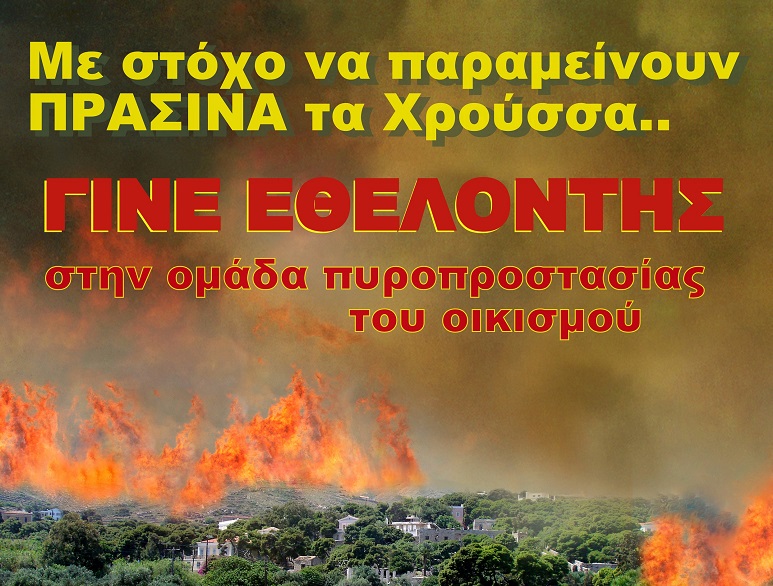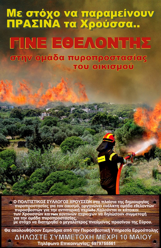 O Πολιτιστικός Σύλλογος Χρούσσων στο πλαίσιο της δημιουργίας πυροπροστασίας για τον οικισμό των Χρούσσων, οργανώνει ευέλικτη ομάδα εθελοντών πυροσβεστών για την αντιπυρική περίοδο. Καλούνται οι κάτοικοι των Χρούσσων και των γύρω κοντινών περιοχών να δηλώσουν συμμετοχή για την ομάδα πυροπροστασίας, με στόχο να διατηρηθεί ο μεγαλύτερος πνεύμονας πρασίνου της Σύρου.