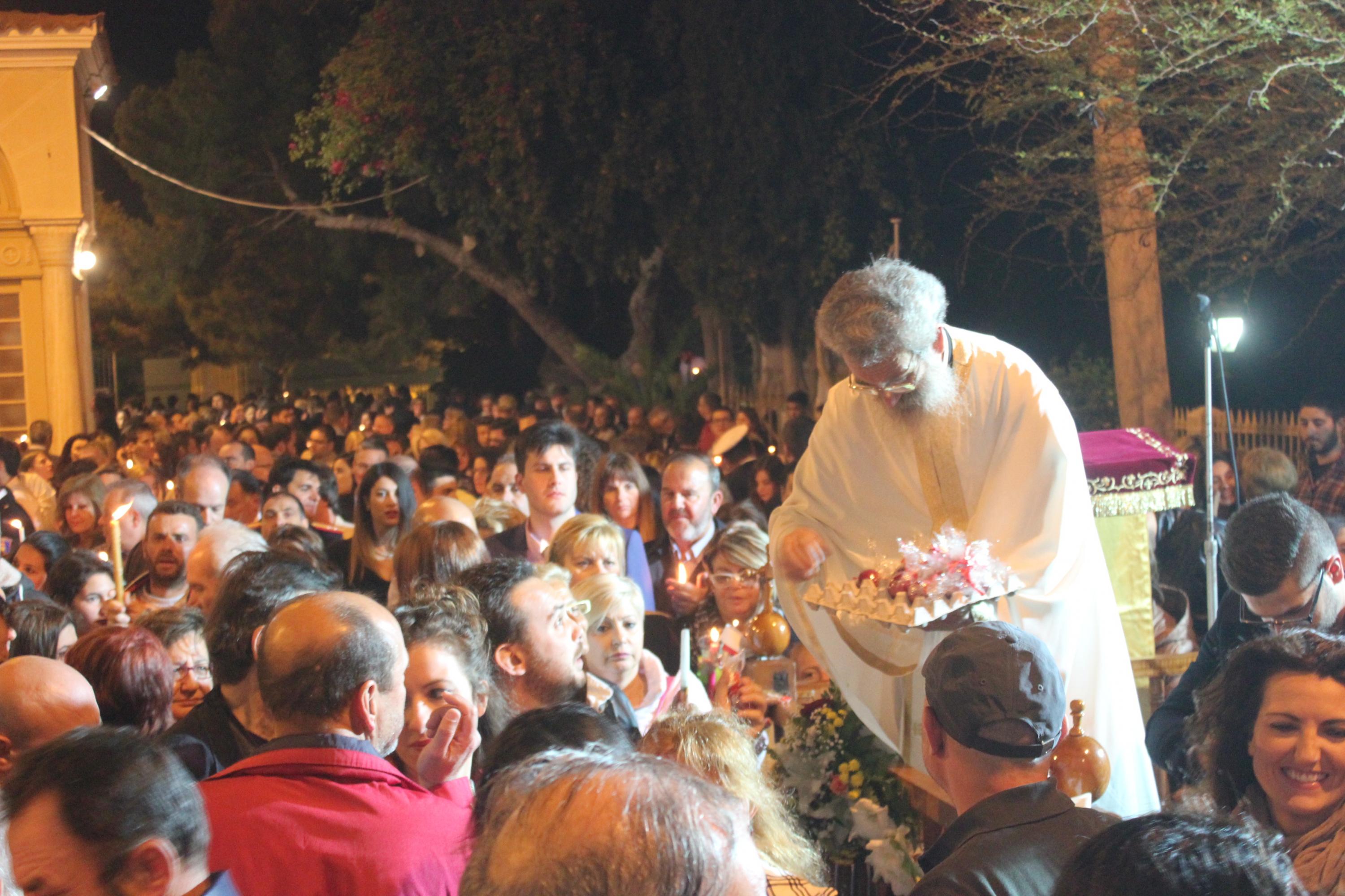 Μετά το άγγελμα του «Χριστός Ανέστη», οι εφημέριοι του Ναού μοίρασαν στους παρευρισκόμενους το καθιερωμένο «κόκκινο αυγό», ευχόμενοι σε όλους «Καλό Πάσχα», με υγεία και χαρά.