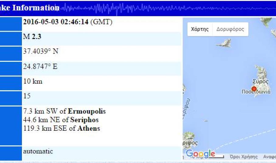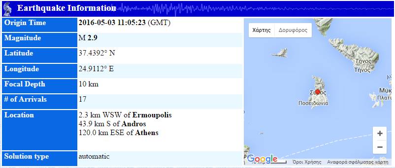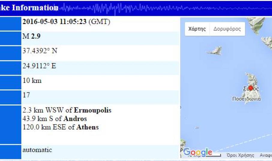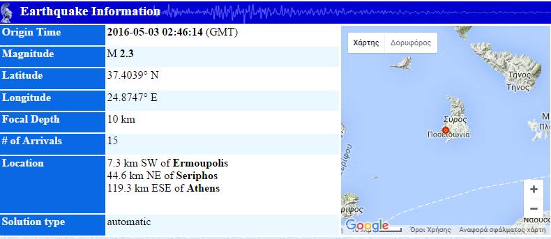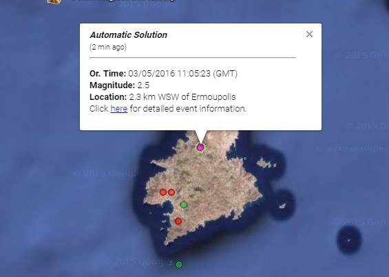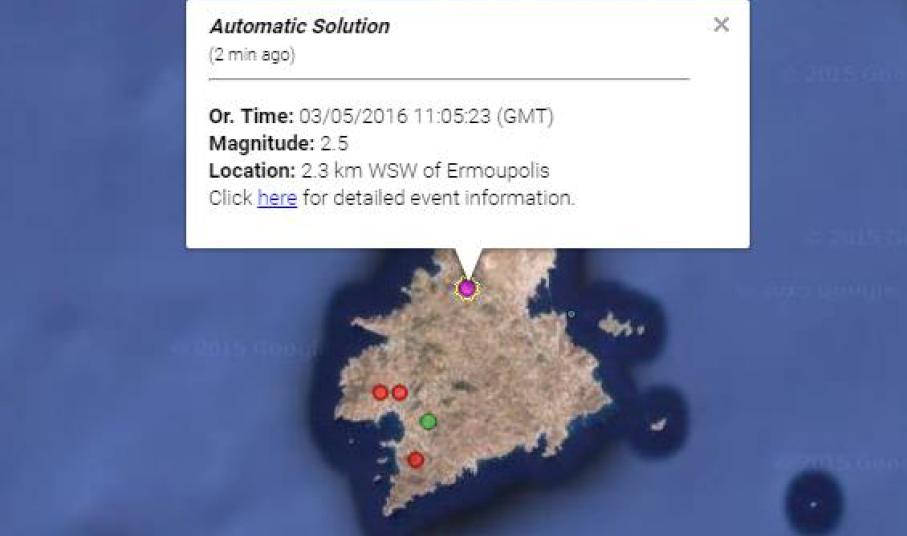 Να σημειωθεί ότι και τα ξημερώματα της Τρίτης καταγράφηκε σεισμός 2.3 βαθμών της κλίμακας ρίχτερ, με το ίδιο εστιακό βάθος σε απόσταση 7,3 χλμ νοτιοδυτικά της Ερμούπολης σύμφωνα με τα επίσημα στοιχεία της ιστοσελίδας του Γεωδυναμικού Ινστιτούτου.