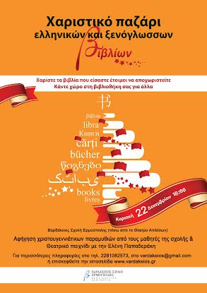 Χαριστικό-ανταλλακτικό παζάρι ελληνικών και ξενόγλωσσων βιβλίων διοργανώνει για τρίτη συνεχή χρονιά η Βαρδάκειος Σχολής Ερμούπολης. Το παζάρι θα πραγματοποιηθεί την Κυριακή 22 Δεκεμβρίου και ώρα 18:00 στο χώρο της Σχολής πίσω από το Θέατρο Απόλλων, δίνοντας την ευκαιρία στους φίλους της να χαρίσουν τα βιβλία που είναι έτοιμοι να αποχωριστούν και να κάνουν χώρο στη βιβλιοθήκη τους για άλλα. Παράλληλα, θα ακολουθήσουν αφηγήσεις χριστουγεννιάτικων παραμυθιών και σκετς από τους μαθητές της σχολής, καθώς και θεατρικό παιχνίδι με την Ελένη Παπαδεράκη. Για περισσότερες πληροφορίες οι ενδιαφερόμενοι μπορούν να απευθυνθούν στο τηλέφωνο 2281082573 και στο vardakeios@gmail.com ή να επισκεφτούν την ιστοσελίδα www. vardakeios.gr.