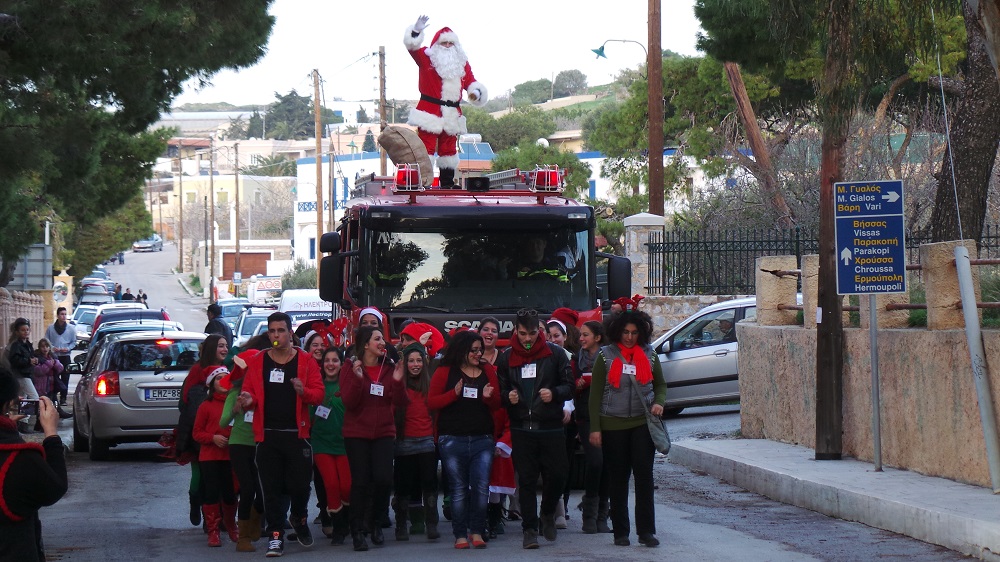 Ο συμπαθής γέροντας με την άσπρη γενειάδα, την κόκκινη στολή και το χαρακτηριστικό γέλιο εμφανίστηκε στο χωριό με όχημα της Πυροσβεστικής Υπηρεσίας του νησιού, ενθουσιάζοντας τα παιδιά και τους δεκάδες επισκέπτες, οι οποίοι τον περίμεναν με ανυπομονησία.