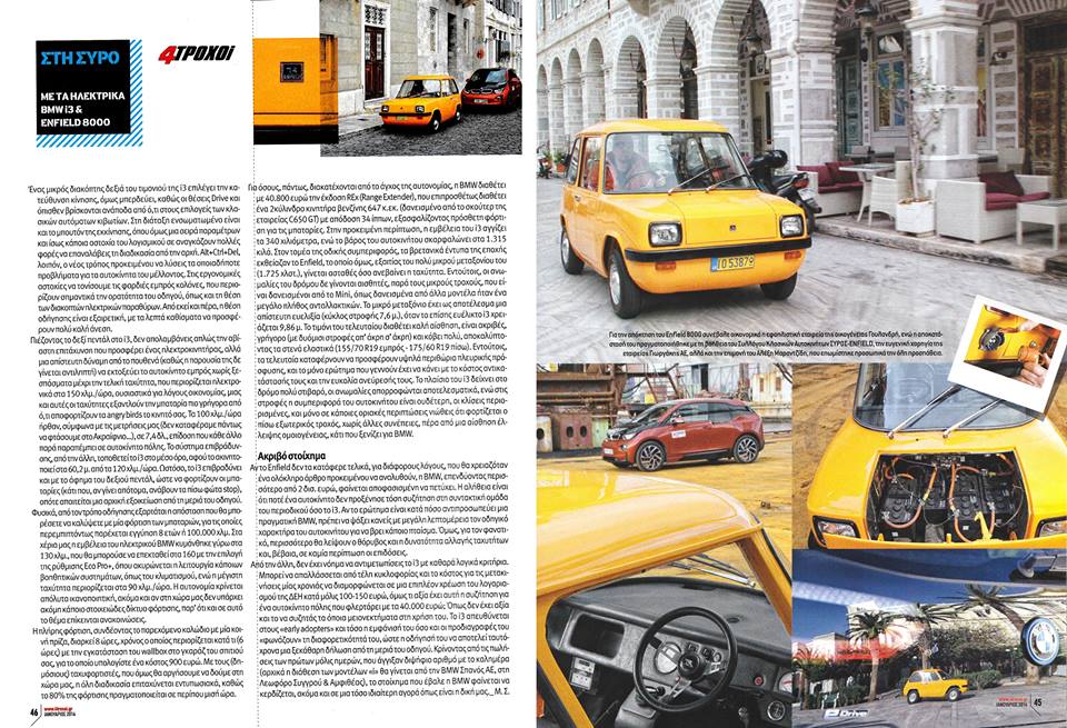 Τις σελίδες του γνωστού περιοδικού “4Τροχοί” (στο τεύχος Ιανουαρίου του 2014), κοσμεί το πρώτο ηλεκτρικό αυτοκίνητο Enfield 8000, στο πλαίσιο ενός συγκριτικού τεστ που πραγματοποιήθηκε στη Σύρο ανάμεσα στο μικρό εντυπωσιακό πορτοκαλί που κατασκευάστηκε στο νησί το 1973 και στο σύγχρονο BMW i3.