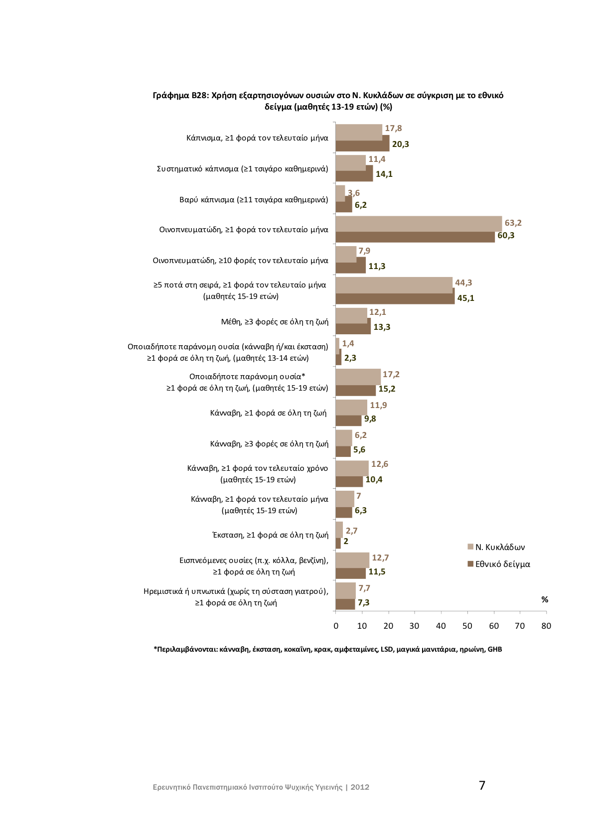 χρήση οποιασδήποτε παράνομης ουσίας (κάνναβη ή/και έκσταση) τουλάχιστον 1 φορά στη ζωή τους (1,8% των αγοριών και 1% των κοριτσιών).