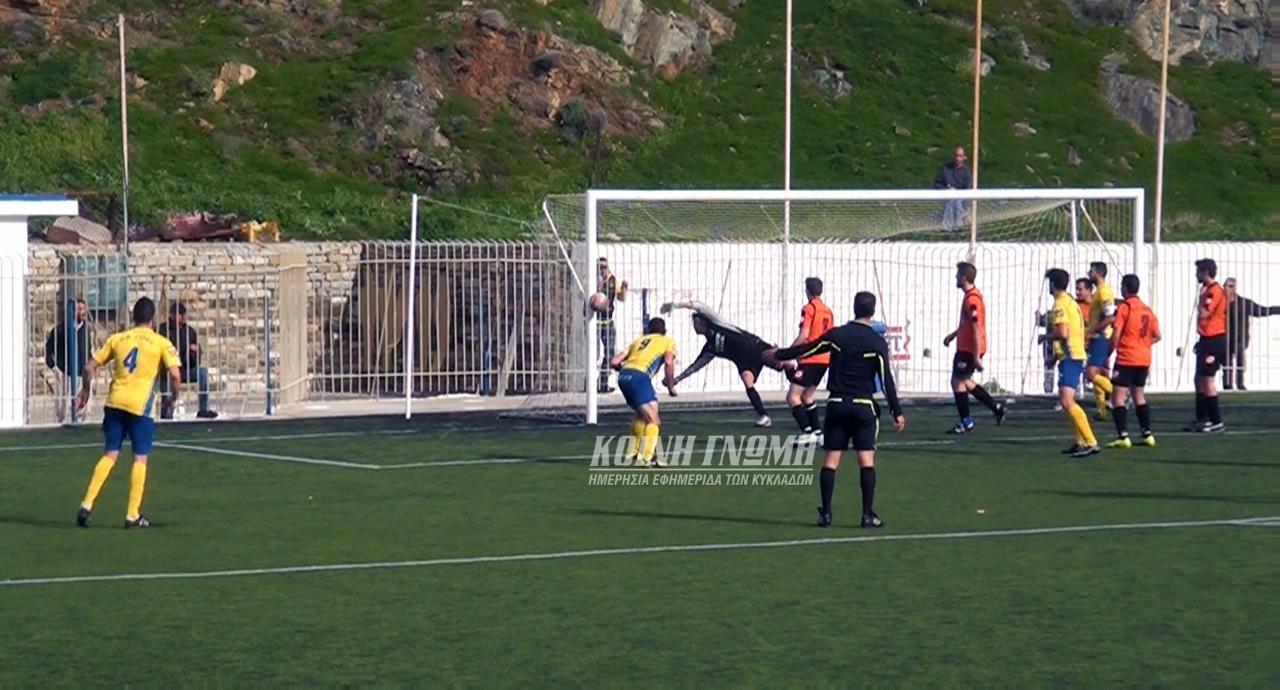Τώρα, ο Α.Ο. Σύρου άνοιξε το σκορ στο 30' με το σουτ του Τζώρτζη από το ύψος της περιοχής και με το γκολ αυτό οι δύο ομάδες οδηγήθηκαν στα αποδυτήρια για την ανάπαυλα του ημιχρόνου. Βέβαια, οι φιλοξενούμενοι θα μπορούσαν να είχαν πετύχει ακόμη ένα γκολ στο πρώτο ημίχρονο, όμως το δεξί κάθετο δοκάρι στέρησε στον Σταματίου το γκολ. Στην επανάληψη οι παίκτες του κ. Ζαχαρίου σφράγισαν τη νίκη καθώς ο Σταματίου στο 64' έκανε το 2-0 και δύο λεπτά αργότερα ο Πρίντεζης πέρασε τη μπάλα πάνω από τον τερματοφύλακα και διαμόρφωσε το τελικό 3-0.
