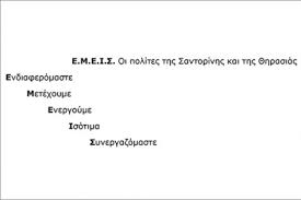 Η νέα Δημοτική Κίνηση, που δημιουργήθηκε την περασμένη εβδομάδα στη Σαντορίνη, επέλεξε να προσδιοριστεί ονοματολογικά με την λέξη «ΕΜΕΙΣ», χρησιμοποιώντας τα αρχικά των λέξεων: Ενδιαφερόμαστε, Μετέχουμε, Ενεργούμε Ισότιμα, Συνεργαζόμαστε.