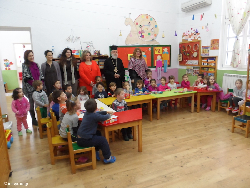 Τον Παιδικό Σταθμό Άνω Μεράς Μυκόνου επισκέφτηκε, κατόπιν προσκλήσεως της Διευθύντριάς του, ο Σεβασμιώτατος Μητροπολίτης Σύρου, συνοδευόμενος από τον Ηγούμενο της Ιεράς Μονής Παναγίας Τουρλιανής, Αρχιμ. Φιλάρετο και τη Δημαρχεύουσα Μυκόνου Ειρήνη Γρυπάρη. Ο κ. Δωρόθεος, ο οποίος δέχτηκε τη θερμή αγάπη εκπαιδευτικών και μαθητών, τέλεσε αγιασμό, ευλόγησε την πρωτοχρονιάτικη πίτα του σχολείου, συνομίλησε με τα παιδιά, τους απηύθυνε πατρικές παραινέσεις και συμβουλές και τους διένειμε δώρα.