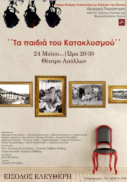 Υπενθυμίζεται ότι στο πλαίσιο των εκδηλώσεων την Τρίτη 24 Μαΐου 2016 και ώρα 20:30 στο Θέατρο Απόλλων θα πραγματοποιηθεί η θεατρική παράσταση «Τα παιδιά του Κατακλυσμού» από τον Σύλλογο Ποντίων και Βορειοελλαδιτών Σύρου.