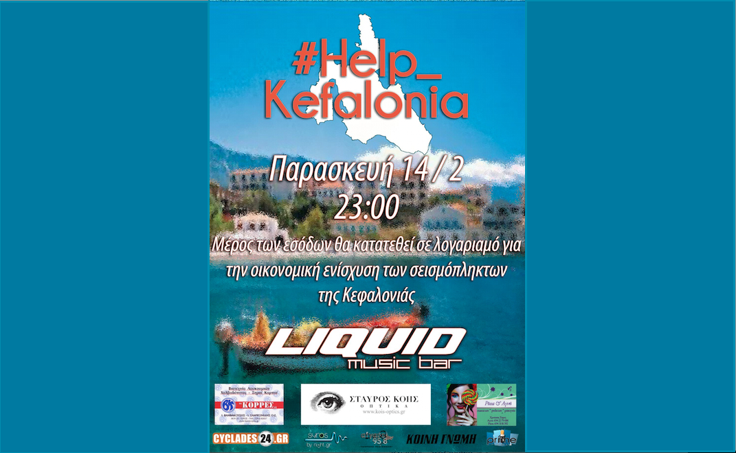 Το liquid καλεί όλους τους πολίτες αυτή την Παρασκευή 14 Φεβρουαρίου με σκοπό την οικονομική ενίσχυση των σεισμόπληκτων στην Κεφαλονιά όπου μέρος των εσόδων θα κατατεθεί σε σχετικό λογαριασμό της Κεντρικής Ένωσης Επιμελητηρίων 5051-070162-301/IBAN GR73 0172 0510 0050 5107 0162 301, στην Τράπεζα Πειραιώς.