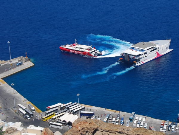 Για την εξυπηρέτηση των δεκάδων ακτοπλοϊκών δρομολογίων της Σαντορίνης και με την τουριστική σεζόν να έχει ήδη ξεκινήσει για το νησί, το ΔΛΤ Θήρας αποφάσισε την τροποποίηση του προγράμματος φορτοεκφόρτωσης στην προβλήτα επικινδύνων φορτίων, προκειμένου από τις 8 το πρωί έως τις 8 το βράδυ να εξυπηρετεί τα επιβατηγά πλοία, με στόχο την αποσυμφόρηση του λιμένα.