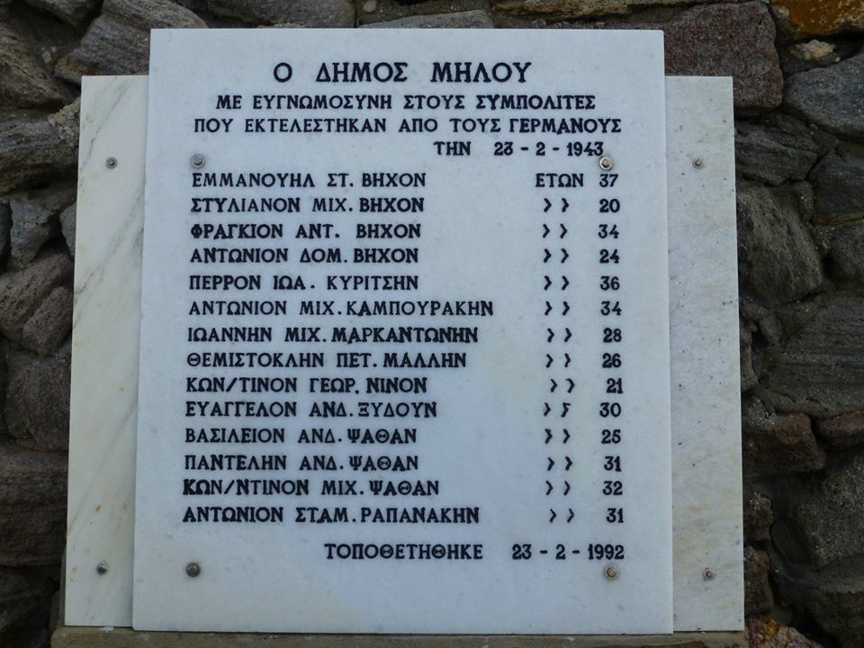 Τιμή στους 14 εκτελεσθέντες από τους Γερμανούς, κατοίκους της Μήλου, απέδωσαν η Δημοτική αρχή και οι πολίτες του νησιού, σε μία εκδήλωση γεμάτη σεβασμό για τα θύματα του ’43, ενώ ακολούθησε και ειδική αφιερωματική βραδιά στα πολεμικά πλοία που βυθίστηκαν στο λιμάνι του Αδάμαντα.