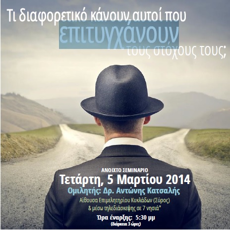 Τα “κλειδιά” για να επιτύχουμε τους στόχους μας, σε ένα συνεχώς μεταβαλλόμενο περιβάλλον, όπου γιγαντώνεται η ματαίωση και κρυσταλλώνονται ολοένα και περισσότερο αρνητικές στάσεις ζωής, θα παρουσιάσει σε ένα μοναδικό σεμινάριο, ο διακεκριμένος καθηγητής Διοίκησης Επιχειρήσεων & ειδικός σε θέματα Ανάπτυξης Ανθρώπινου Δυναμικού, Δρ. Αντώνης Κατσαλής.