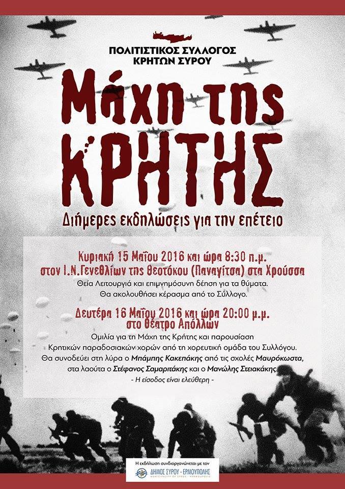 Ο Πολιτιστικός Σύλλογος Κρητών Σύρου και ο Δήμος Σύρου – Ερμούπολης συνδιοργανώνουν εκδήλωση για την επέτειο της Μάχης της Κρήτης, τη Δευτέρα 16 Μαΐου 2016 και ώρα 20:00, στο Θέατρο Απόλλων.