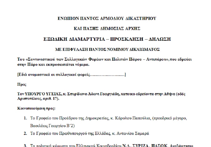 Επιπρόσθετα, στην εξώδικη διαμαρτυρία, αναφέρονται αναλυτικά και με σαφήνεια όλα τα άρθρα της νομοθεσία που “παραβιάζονται” από τη μη ανταπόκριση του υπουργείου Υγείας στα αιτήματα των πολιτών ενώ υπογραμμίζεται πως, ο Άδωνις Γεωργιάδης, “εγκαλείται διότι, α. δεν έχει δρομολογήσει τις απαραίτητες ενέργειες προκειμένου να καλύψει όλα τα οργανικά κενά που υφίστανται στο Κέντρο Υγείας Πάρου – Αντιπάρου” και β. επειδή “δεν κάλυψε άμεσα τις θέσεις παιδιάτρων στο Κέντρο Υγείας Πάρου – Αντιπάρου, που είναι άμεση προτεραιότητα και επιτακτική ανάγκη”. Όσον αφορά στον δεύτερο λόγο, το Συντονιστικό προσθέτει πως, “Προς τούτο σας γνωστοποιούμε (αν δεν το γνωρίζετε ήδη) την πρόσφατη έκθεση – κόλαφο για τις επιπτώσεις της λιτότητας στην Δημόσια υγεία της Ελλάδας από καθηγητές της Οξφόρδης και του Κέμπριτζ που μεταξύ άλλων αναφέρονται σε αποδείξεις για αυξανόμενο ρυθμό παιδικής θνησιμότητας και επανεμφάνισης μολυσματικών ασθενειών που τις τελευταίες δεκαετίες είχαν καταστεί σπάνιες. Ο καθηγητής Ντέιβιντ Στάκλερ (Dr. David Stuckler), μάλιστα, συγκρίνοντας τις περιπτώσεις Ελλάδας και Ισλανδίας αποδεικνύει ότι “συμφέρει”, και σε περίοδο λιτότητας, η βελτίωση της υγείας του πληθυσμού, γιατί βελτιώνει την ποιότητα του εργατικού δυναμικού”. Μετά τα προαναφερθέντα, οι συνυπογράφοντες το υπόμνημα επισημαίνουν, “Δηλώνουμε ότι, α. καθίστασθε απόλυτα υπεύθυνος για ό,τι συμβεί σε όσους διαμένουν και σε όσους επισκέπτονται την Πάρο και την Αντίπαρο εξαιτίας των ελλείψεων σε ιατρικό, νοσηλευτικό προσωπικό, σε διασώστες του ΕΚΑΒ, σε εξοπλισμό και αναλώσιμα στο Κέντρο Υγείας Πάρου – Αντιπάρου και της πλημμελούς λειτουργίας του, β. ουδεμία ευθύνη φέρουμε για τις αντιδράσεις των κατοίκων που διαμαρτύρονται εδώ και τέσσερα έτη για την υποστελέχωση και τις άλλες ελλείψεις του Κέντρου Υγείας Πάρου – Αντιπάρου και γ. θα προβούμε, αν χρειαστεί, σε όλες τις νόμιμες και ενδεδειγμένες ενέργειες κατά παντός υπευθύνου για την προάσπιση και διαφύλαξη των νομίμων δικαιωμάτων και συμφερόντων των φορολογουμένων κατοίκων Πάρου – Αντιπάρου”.