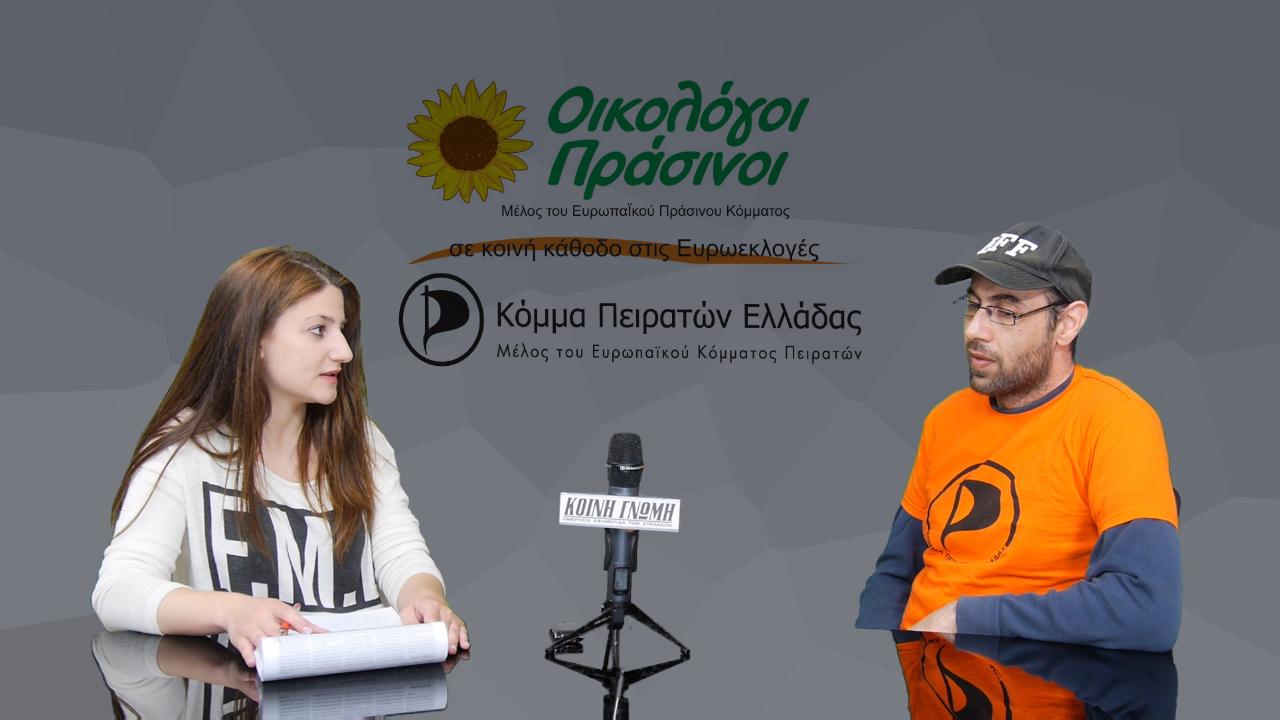“Η συνεργασία με τους Οικολόγους Πράσινους αποφασίστηκε με βασική αιτία ότι ήδη στο ευρωπαϊκό κοινοβούλιο οι εκλεγμένοι Πειρατές ευρωβουλευτές ανήκουν στην ίδια ομάδα με τους Πράσινους. Σε ευρωπαϊκό επίπεδο υπήρχε ήδη μία συνεργασία και πρωτοβουλίες των Πρασίνων στηρίζονται από τους Πειρατές καθώς και το αντίστροφο. Όσον αφορά στη συνεργασία που έχει ουσιαστική σημασία για τη συγκεκριμένη εκλογική αναμέτρηση, πιστεύω ότι οι Ευρωπαίοι Πειρατές και τα Πράσινα κόμματα στην Ευρώπη είμαστε οι μόνοι που συμμετέχουμε στις ευρωεκλογές με πανευρωπαϊκή “ατζέντα”. Δηλαδή οι θέσεις και το μανιφέστο μας για την εκλογική διαδικασία έχει συζητηθεί και συμφωνηθεί από όλα τα ευρωπαϊκά κόμματα Πειρατών και αντίστοιχα συμβαίνει και στους Πράσινους. Αυτή είναι μία ουσιαστική διαφορά του Συνασπισμού μας αυτή τη στιγμή, σε σχέση με αυτό που προτείνουν όλα τα υπόλοιπα κόμματα στον Ελληνικό χώρο”.