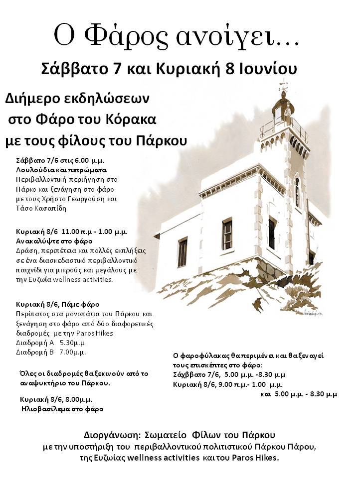 Διήμερο εκδηλώσεων έχει προγραμματιστεί στο φάρο του Kόρακα το Σάββατο 7 και τη Κυριακή 8 Ιουνίου από το Σωματείο Φίλων του Πάρκου και την υποστήριξη του περιβαλλοντικού πολιτιστικού Πάρκου Πάρου.