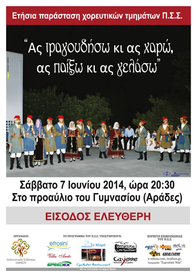 Στο πλαίσιο των εκδηλώσεων που διοργανώνει ο πολιτιστικός σύλλογος Σίφνου, θα παρουσιάσει το Σάββατο 7 Ιουνίου και ώρα 20:30μ.μ. την ετήσια παράσταση των παραδοσιακών χορευτικών ομάδων του συλλόγου, στο προαύλιο του Γυμνασίου Αράδες, με θέμα ''Ας τραγουδήσω, ας χορέψω, και ας γελάσω''. Ο Σύλλογος έχει μεγάλη παρουσία στα πολιτιστικά πεπραγμένα του νησιού καθώς διοργανώνει συχνά δραστηριότητες και εκδηλώσεις προκειμένου να συνεισφέρει σ αυτόν τον τομέα.