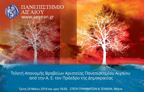Ο Πρόεδρος του Συμβουλίου του Πανεπιστημίου Αιγαίου, Ομότιμος Καθηγητής Σταύρος Θωμαδάκης και ο Πρύτανης του Πανεπιστημίου Αιγαίου, Καθηγητής Στέφανος Γκρίτζαλης έχουν τη χαρά και την τιμή να σας προσκαλέσουν στην Τελετή Απονομής Φοιτητικών Βραβείων Αριστείας του Ιδρύματος, που θα πραγματοποιηθεί στην Αθήνα, στη Στέγη του Ιδρύματος Ωνάση (Κεντρική Σκηνή) την Τρίτη 24 Μαΐου 2016 και ώρα 18:30. Τα Βραβεία Αριστείας θα απονείμει η Α.Ε. ο Πρόεδρος της Δημοκρατίας Κύριος Προκόπης Παυλόπουλος.