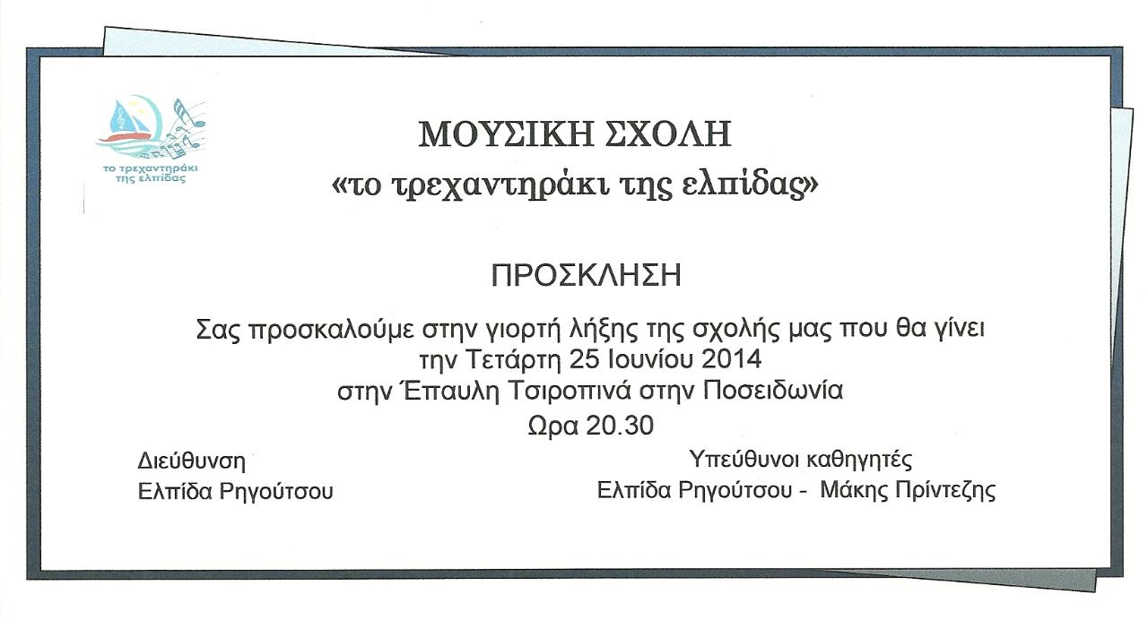Αυλαία ''πέφτει'' για την μουσική σχολή '' Το τρεχαντηράκι της ελπίδας'' με τη γιορτή λήξης της σχολής αύριο στις οκτώ και μισή το βράδυ στην έπαυλη Τσιροπινά στην περιοχή της Ποσειδωνίας.
