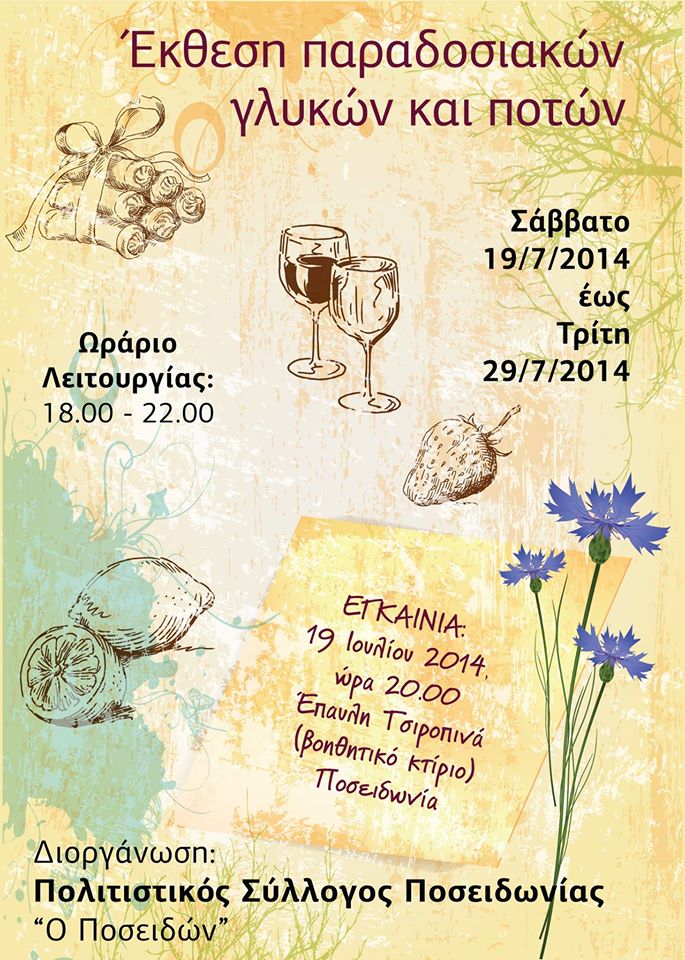 Ο Πολιτιστικός Σύλλογος Ποσειδωνίας “ο Ποσειδών” συμμετέχοντας στις εκδηλώσεις “Σύρος – Πολιτισμός 2014” του Δήμου Σύρου – Ερμούπολης προσκαλεί το κοινό στα εγκαίνια της “Έκθεσης παραδοσιακών γλυκών & ποτών” τα οποία θα πραγματοποιηθούν αύριο στις 20:00, στο βοηθητικό κτίριο του πρώην Δημαρχείου Ποσειδωνίας. Η έκθεση θα διαρκέσει έως την Τρίτη 29 Ιουλίου 2014 και θα λειτουργεί καθημερινά 18:00 – 22:00.
