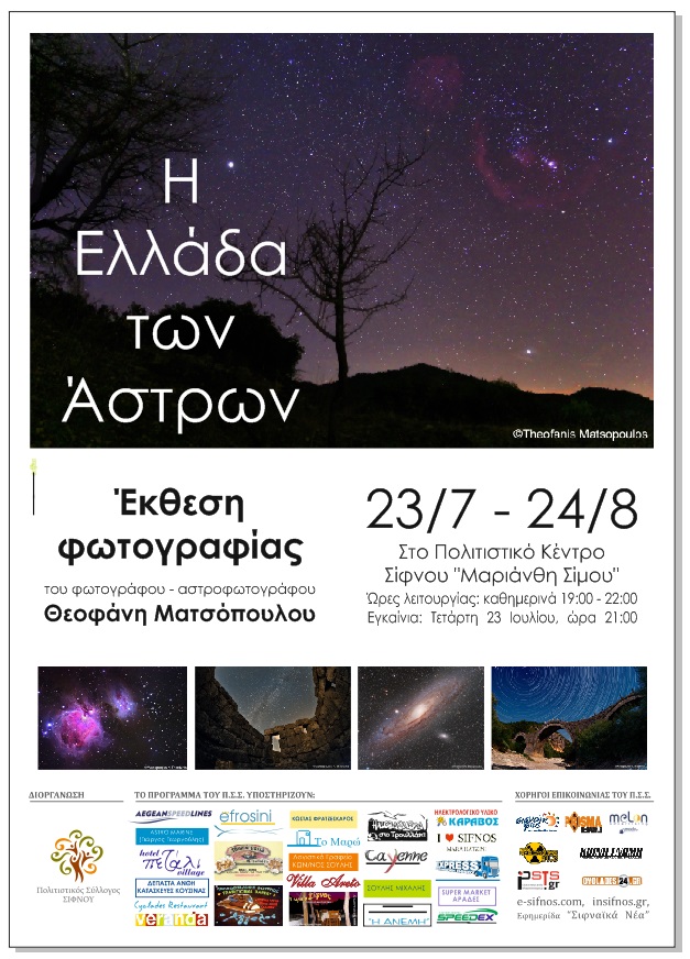 Σε κόσμους μακρινούς, φωτεινούς και γιγάντιους, τους οποίους αδυνατεί να συλλάβει η ανθρώπινη φαντασία, μεταφέρει το φιλότεχνο κοινό της Σίφνου η έκθεση φωτογραφίας του φωτογράφου - αστροφωτογράφου Θεοφάνη Ν. Ματσόπουλου με τίτλο “Η Ελλάδα των Άστρων”.