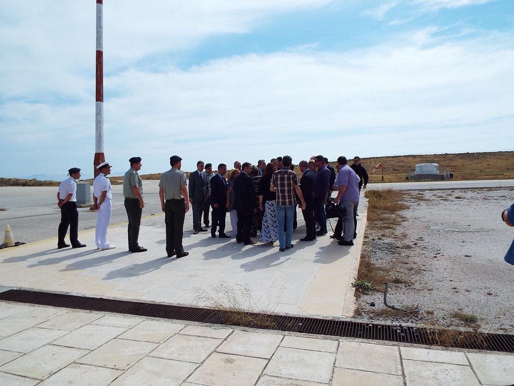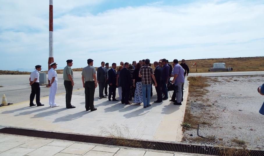 Τον Υπουργό, μετά την αποβίβασή του από το ελικόπτερο, υποδέχτηκε ο Δήμαρχος. Αν και ο λόγης της σημερινής επίσκεψης του κ. Καμμένου, αφορά στην υπογραφή του συμφώνου συναντήληψης για την αξιοποίηση και εκμετάλλευση του στρατοπέδου, οι πρώτες συζητήσεις αφορούσαν στο αεροδρόμιο της Σύρου, με τον Υπουργό να επισημαίνει τη σημαντική καθυστέρηση στη βελτίωσή του, λόγω του πολεοδομικού ζητήματος. Με τη σειρά του, ο κ. Μαραγκός του τόνισε τη σημασία της δικής του βοήθειας, όπως ακριβώς με το ζήτημα του στρατοπέδου. Παράλληλα, την βούληση να τελειώσει άμεσα και το θέμα του αεροδρομίου, εξέφρασε ο Γενικός Γραμματέας, προσκαλώντας τον Δήμαρχο την επόμενη εβδομάδα για μία συνάντηση, στα γραφεία του Υπουργείου, ενώ ο κ. Μαραγκός και τα στελέχη του Υπουργείου, μαζί με τον κ. Καμμένο, συζήτησαν περισσότερο από 15 λεπτά, σχετικά με το ζήτημα, σε χαλαρό κλίμα, προκειμένου να εντοπιστούν τα κωλύματα, που αντιμετωπίζονται.