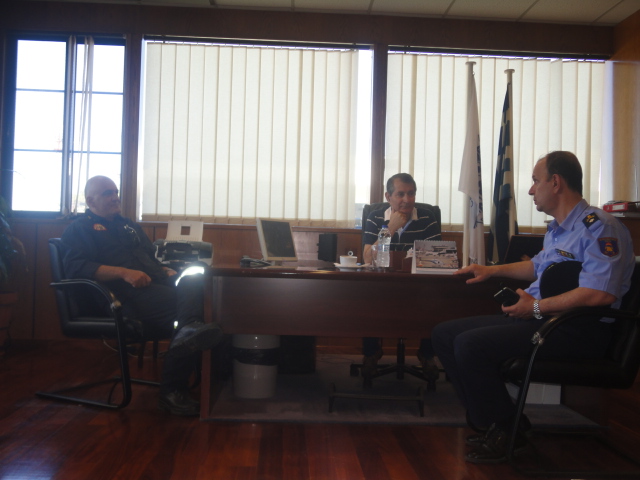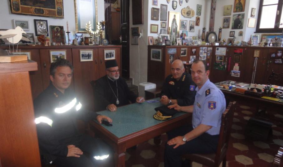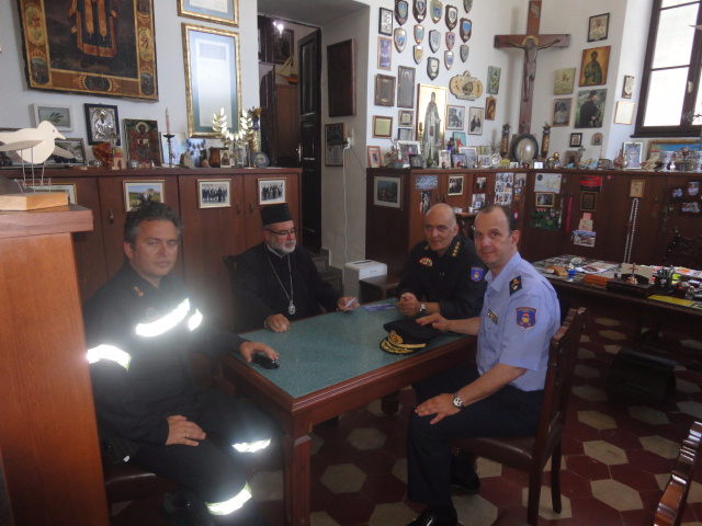 Στην συνέχεια συναντήθηκε πρωτίστως με τον Σεβασμιότατο Επίσκοπο Κω και Νισύρου Ναθαναήλ, τον Αντιπεριφερειάρχη Ν. Αιγαίου Χαράλαμπο Κόκκινο, τον Έπαρχο Κω και Νισύρου Χαλκιδιό Γεώργιο, τον Δήμαρχο Κω Κυρίτση Γεώργιο και τον Δήμαρχο Ρόδου Χατζηδιάκου Φώτιο όπου συζητήθηκαν θέματα που άπτονται αμιγώς στην Επιχειρησιακή ετοιμότητα των Πυροσβεστικών Υπηρεσιών καθώς και όλων των εμπλεκόμενων φορέων προς αντιμετώπιση των δασικών πυρκαγιών κατά την τρέχουσα αντιπυρική περίοδο. Τέλος συναντήθηκε με τους αερολιμενάρχες των Κ/Α Κω Καλούδη Αντώνιο και Κ/Α Ρόδου Κριτσινέλια Ξανθή όπου συζητήθηκαν θέματα για την πυρασφάλεια των αεροδρομίων.