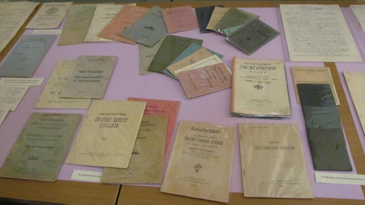 Μεταξύ άλλων, στην έκθεση περιλαμβάνεται το καταστατικό του Εργατικού Κέντρου με τις κατά καιρούς τροποποιήσεις του, τροποποιήσεις οι οποίες μαρτυρούν τις προσαρμογές του Δευτεροβάθμιου Οργάνου στις μεταβαλλόμενες κοινωνικές και πολιτικές συγκυρίες. Επιπλέον, περιέχονται τα καταστατικά πολλών πρωτοβάθμιων οργανώσεων που υπάγονταν στο Εργατικό Κέντρο Κυκλάδων, ενώ οι επισκέπτες μπορούν να εντοπίσουν αρχειακό υλικό που αναδεικνύει την πολλαπλή δράση της ηγεσίας, τη σχέσεις της με τα υπαγόμενα σε αυτή σωματεία καθώς και με τη Γενική Συνομοσπονδία Εργατών Ελλάδος.