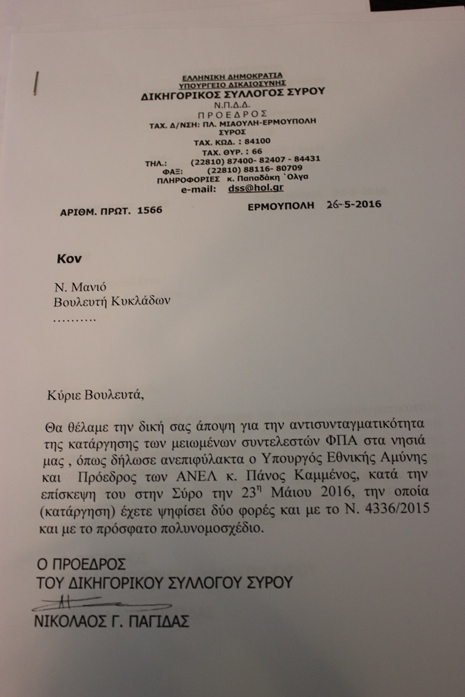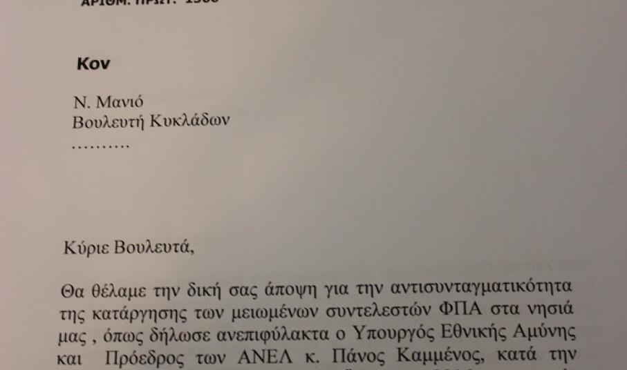 Καυτηριάζοντας τη δημόσια τοποθέτηση του κ. Καμμένου δύο ημέρες μετά τη θετική ψήφο του στη Βουλή, με την οποία ενέκρινε την κατάργηση του ειδικού καθεστώτος του ΦΠΑ σε μία νέα σειρά νησιών και στις Κυκλάδες, σχολίασε χαρακτηριστικά πως, ““Χαιρετίζουμε” τη δήλωση του Υπουργού Εθνικής Άμυνας περί αντισυνταγματικότητας της κατάργησης των μειωμένων συντελεστών”. Με φόντο τα ανωτέρω, αλλά και την ψήφο των κυβερνητικών βουλευτών στο πολυνομοσχέδιο, μέσω του οποίου “πέρασε” και η αύξηση του νησιώτικου ΦΠΑ, έκανε αναφορά στις επιστολές που απέστειλε ο Σύλλογος προς τους ίδιους, ζητώντας τους να πάρουν θέση δημόσια για τις δηλώσεις του Υπουργού. Συμπληρωματικά, γνωστοποίησε και την ανάλογου ύφους επιστολή προς τον βουλευτή της αντιπολίτευσης, Γιάννη Βρούτση, για τον οποίο επεσήμανε πως, είχε υποστηρίξει το μέτρο επί της ουσίας, από πέρυσι το καλοκαίρι.