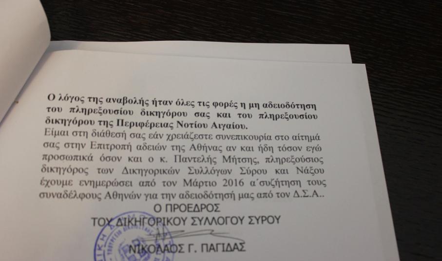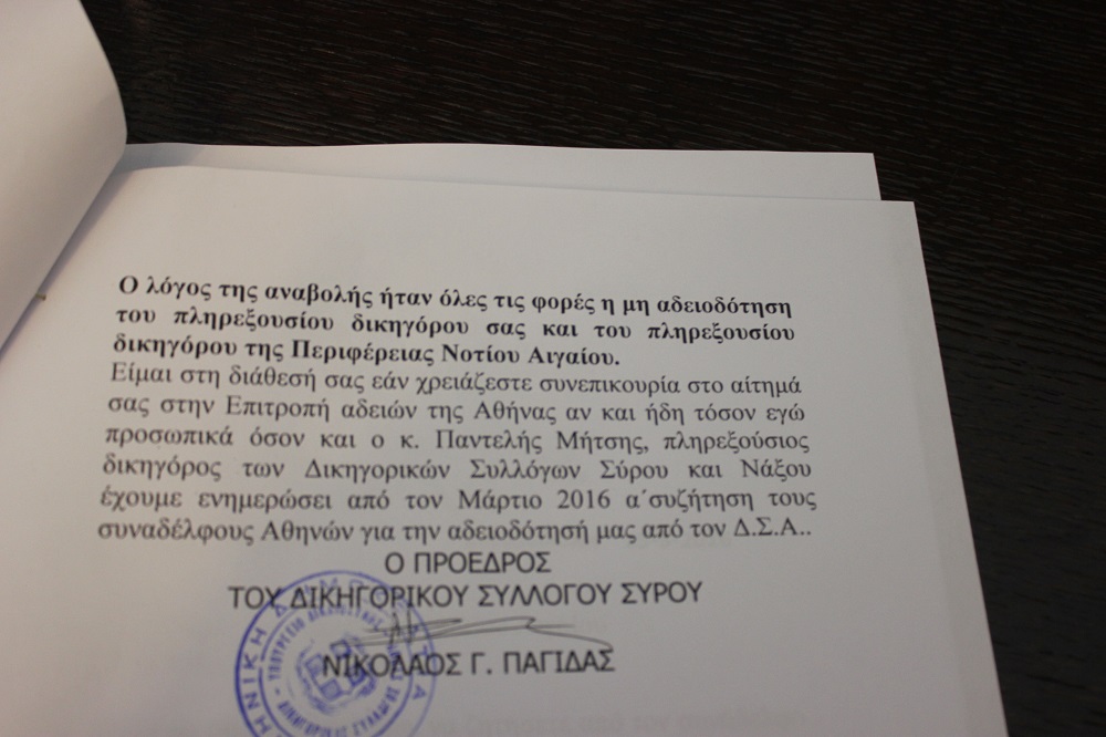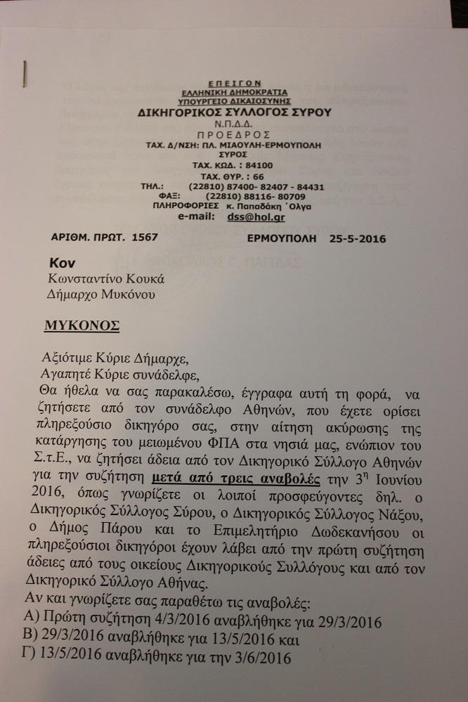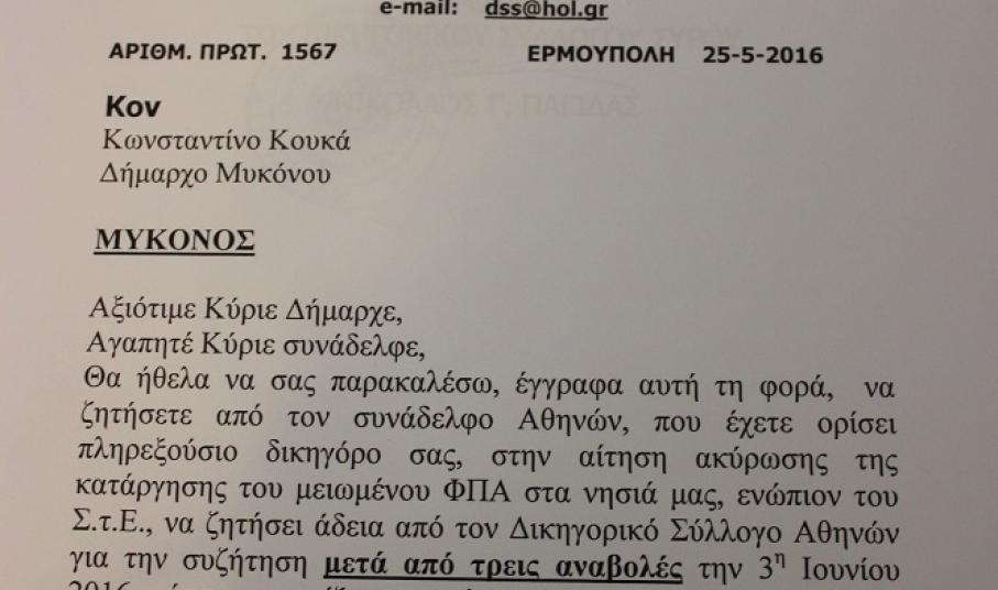 Γνωστοποιώντας δε, πως, ο Δικηγορικός Σύλλογος Σύρου, ο Δικηγορικός Σύλλογος Νάξου, ο Δήμος Πάρου, καθώς επίσης και το Επιμελητήριο Δωδεκανήσου που έχουν ασκήσει προσφυγή, “έχουν λάβει άδειες για τους πληρεξουσίους δικηγόρους τους από τους οικείους Δικηγορικούς Συλλόγους” και δη, από την πρώτη προγραμματισμένη ημερομηνία συζήτησης, κάλεσε την Περιφέρεια Νοτίου Αιγαίου και τον Δήμο Μυκόνου με σχετικές επιστολές που απεστάλησαν στις 25/5/2016 στον Περιφέρειάρχη, Γιώργο Χατζημάρκο και τον δήμαρχο, Κωνσταντίνο Κουκά να προβούν στις ανάλογες ενέργειες για τον πληρεξούσιο δικηγόρο τους καταθέτοντας σχετικό αίτημα στην Επιτροπή Αδειών της Αθήνας. Επαναλαμβάνοντας μάλιστα πως, ο Δικηγορικός Σύλλογος Σύρου έχει λάβει άδεια, όπως και οι προαναφερόμενοι προσφεύγοντες, επεσήμανε πως, χρήσιμο θα ήταν να ενεργήσουν άμεσα τόσο η Περιφέρεια, όσο και η πλευρά του Δήμου Μυκόνου.