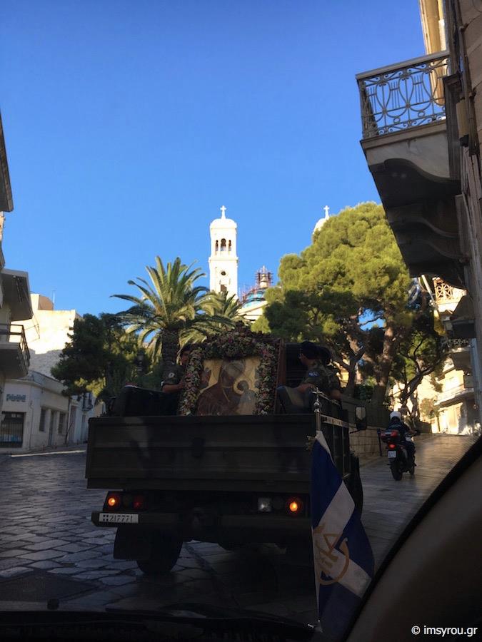Πλήθος πιστών κι εκπρόσωποι της Τοπικής Αυτοδιοίκησης μετέβησαν στο Ναό παραμένοντας στον αύλιο χώρο όπου κι έγινε η υποδοχή της ιερής εικόνας, την οποία συνόδευσαν ο Σεβασμιώτατος Μητροπολίτης Σύρου, κ. Δωρόθεος Β΄, μέλη του κλήρου, ενώ πρέπει να τονισθεί πως, η μεταφορά της πραγματοποιήθηκε με στρατιωτικό όχημα.