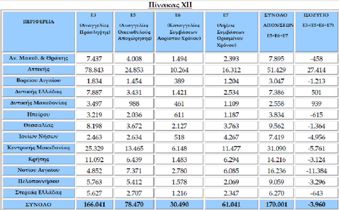 Πιο συγκεκριμένα, σύμφωνα με τους πίνακες, στους οποίους απεικονίζονται τα στοιχεία του πληροφοριακού συστήματος του Υπουργείου, οι προσλήψεις, που καταγράφηκαν στο Νότιο Αιγαίο για τον μήνα Σεπτέμβριο ήταν 4.852, ενώ αντίστοιχα οι αποχωρήσεις άγγιξαν τις 16.236. Η διαφορά στο ισοζύγιο προσλήψεων – αποχωρήσεων διαμορφώθηκε στις - 11.384 θέσεις εργασίας.
