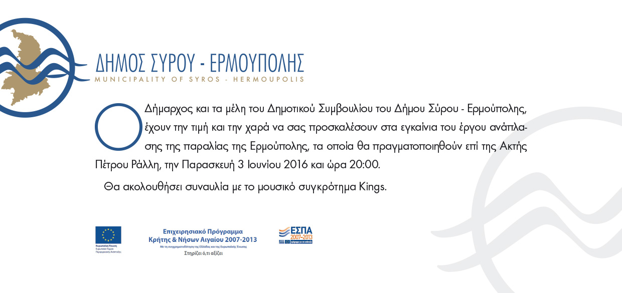 O Δήμος Σύρου - Ερμούπολης ενημερώνει τους επισκέπτες και τους δημότες του νησιού ότι, λόγω των εγκαινίων του έργου ανάπλασης της παραλίας της Ερμούπολης, από την Παρασκευή 3 Ιουνίου 2016 από ώρα 19:30 και έως το Σάββατο 4 Ιουνίου 2016 και ώρα 00:30, θα διακοπεί η κυκλοφορία της παραλιακής οδού, από το ύψος της οδού Ελ. Βενιζέλου μέχρι και την πλατεία Κανάρη (Δημοτικό Λιμενικό Ταμείο).