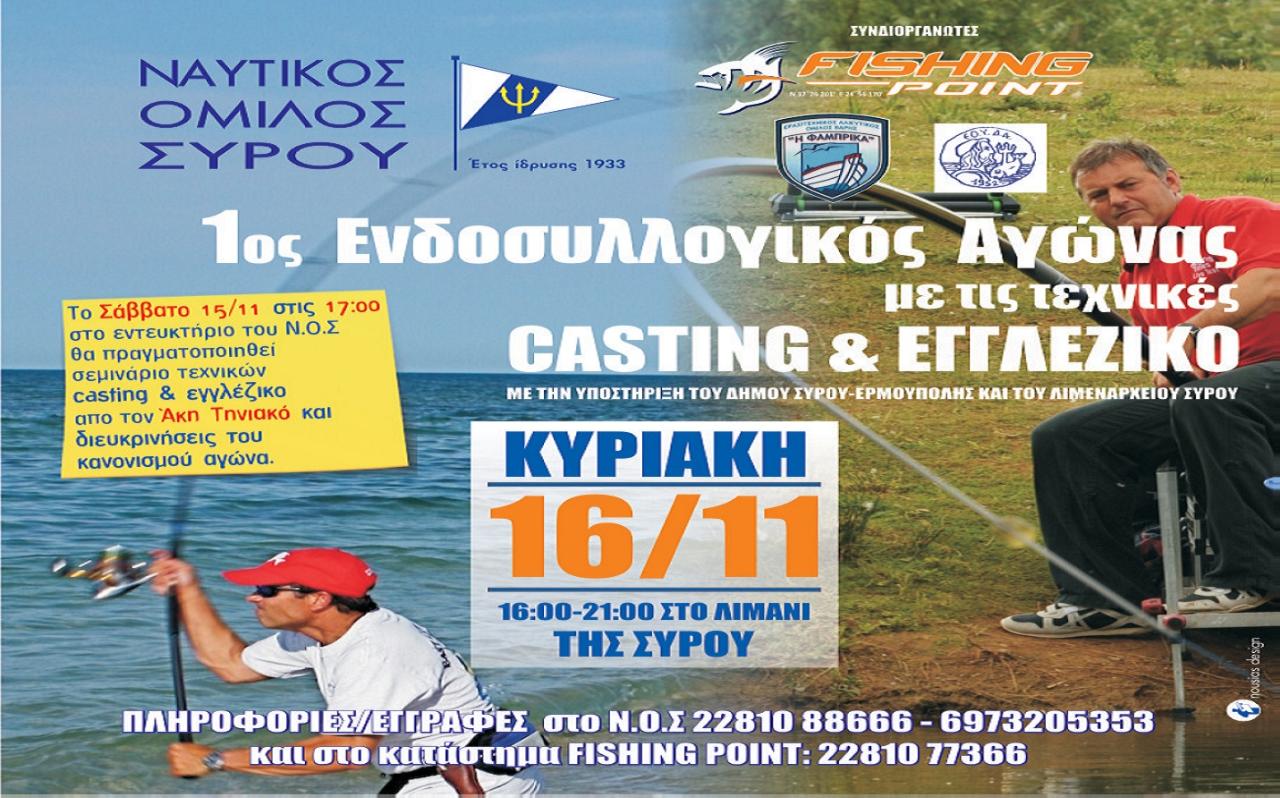 Μία μέρα νωρίτερα και συγκεκριμένα το Σάββατο 15 Νοεμβρίου στις 17:00 θα πραγματοποιηθεί στο εντευκτήριο του Ναυτικού Ομίλου Σύρου, σεμινάριο τεχνικών Casting και Εγγλέζικο από τον Άκη Τηνιακό, αλλά και διευκρινιστούν οι κανονισμοί αγώνα.
