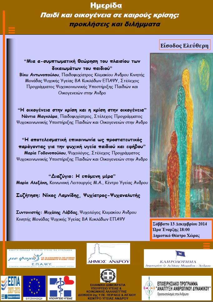 Ημερίδα με θέμα “Παιδί και οικογένεια σε καιρούς κρίσεις: προκλήσεις και διλήμματα” οργανώνει η Κινητή Μονάδα Ψυχικής Υγείας ΒΑ Κυκλάδων, Ε.Π.Α.Ψ.Υ. στο Δημοτικό Θέατρο της Άνδρου το Σάββατο 13 Δεκεμβρίου στις 18:00.