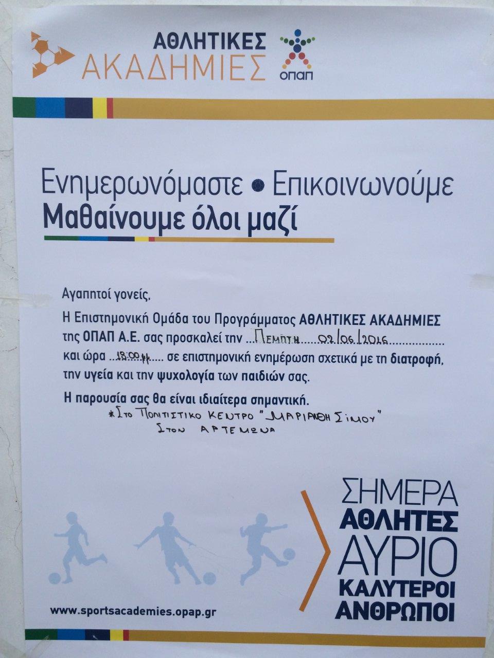 Η Επιστημονική Ομάδα του Προγράμματος "Αθλητικές Ακαδημίες" της ΟΠΑΠ Α.Ε διοργανώνει σήμερα στις 18:00 επιστημονική ενημέρωση σχετικά με τη διατροφή, την υγεία και την ψυχολογία των παιδιών.