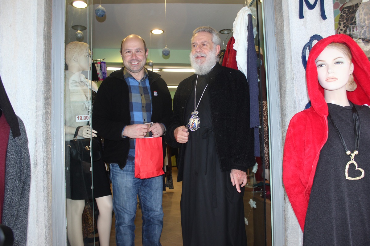 Αψηφώντας τον βροχερό καιρό και διατηρώντας το χαμόγελο στα χείλη του, ο κ. Δωρόθεος δώρισε στους καταστηματάρχες το καθιερωμένο Χριστόψωμο, ένα από τα ομορφότερα έθιμα των άγιων αυτών ημερών. Εκτιμώντας ότι η πίστη και η αγάπη αποτελούν τα απαραίτητα εφόδια για να διακρίνει κανείς ότι πίσω από την καταχνιά υπάρχει πάντα το φως, ευχήθηκε σε όλους το 2015 να φέρει την ελπίδα στην καρδιά μας, την αισιοδοξία στα παιδιά μας και το χαμόγελο στα πρόσωπά μας.