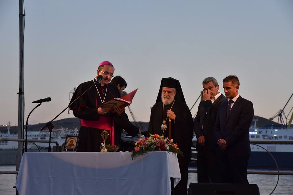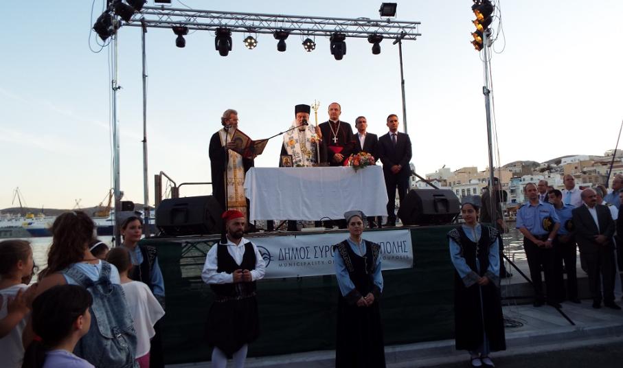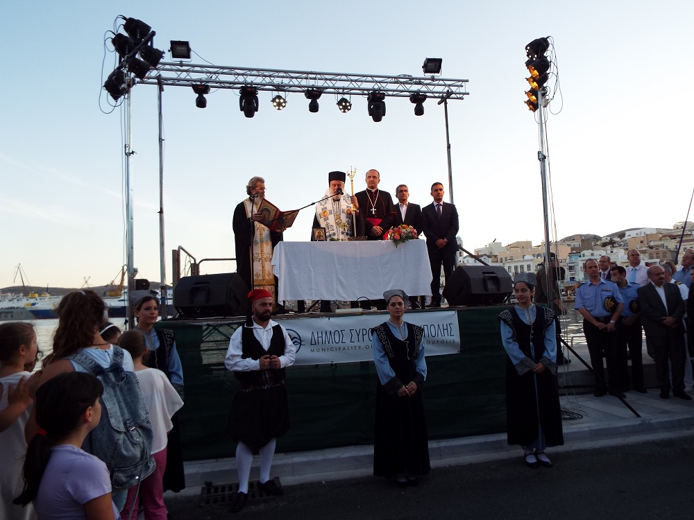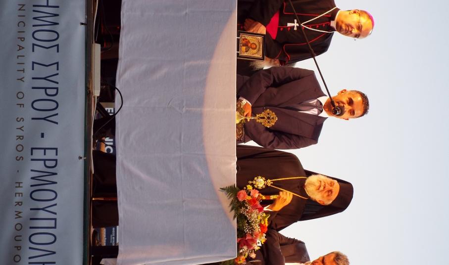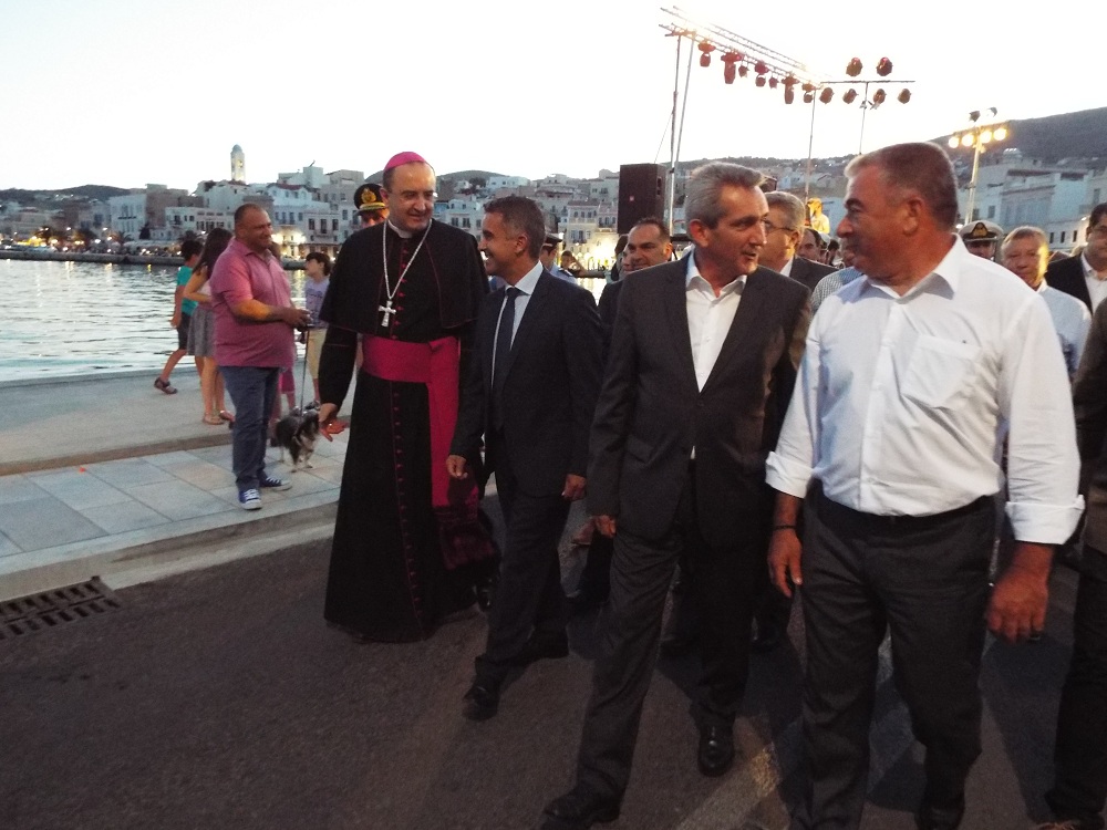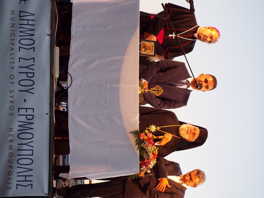 Χαιρετισμό επίσης απηύθυνε και ο Επίσκοπος της Καθολικής Εκκλησίας, π. Πέτρος Στεφάνου, ο οποίος σημείωσε, πως παρά την πολύμηνη ταλαιπωρία κατοίκων και επιχειρηματιών, παραδώθηκε στο νησί ένα άρτιο έργο, που βελτιώνει την εικόνα του. Ευχαρίστησε όλους, όσοι συνέβαλλαν στην υλοποίηση αυτού του έργου, ενώ ευχήθηκε στη δημοτική αρχή τη συνέχιση των έργων προς όφελος των κατοίκων της Σύρου.
