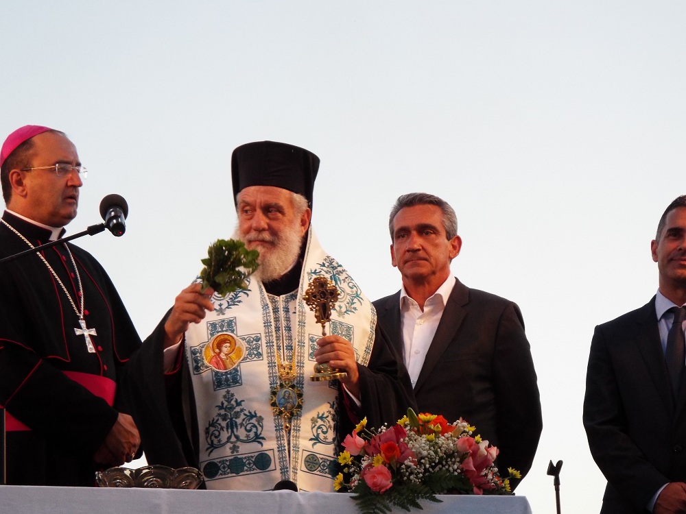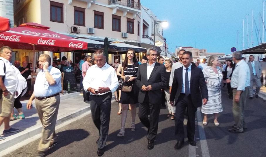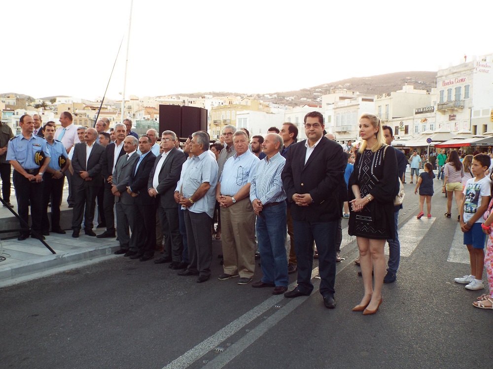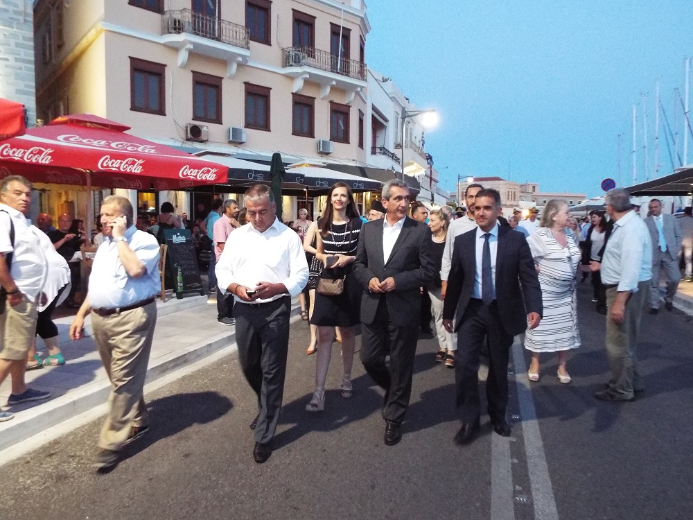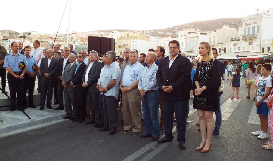 Η επίσημη ευλογία και εγκαινίαση του αναπλασμένου τμήματος του παραλιακού μετώπου της Ερμόυπολης, πραγματοποιήθηκε σήμερα το απόγευμα, παρουσία των επικεφαλής των δύο Εκκλησιών, Δωρόθεου Β΄ και π. Πέτρου Στεφάνου, αντίστοιχα, του Περιφερειάρχη Νοτίου Αιγαίου, κ. Γιώργου Χατζημάρκου, του Δημάρχου Σύρου - Ερμούπολης, Γιώργου Μαραγκού, πλήθους αιρετών, εκπροσώπων του Δήμου και της Περιφέρειας, της πρώην δημοτικής και περιφερειακής αρχής, που συνέβαλαν στην ωρίμανση και ένταξη του έργου στο ΕΣΠΑ, καθώς και πλήθους πολιτών, οι οποίοι γέμισαν τις επιχειρήσεις της παραλίας.