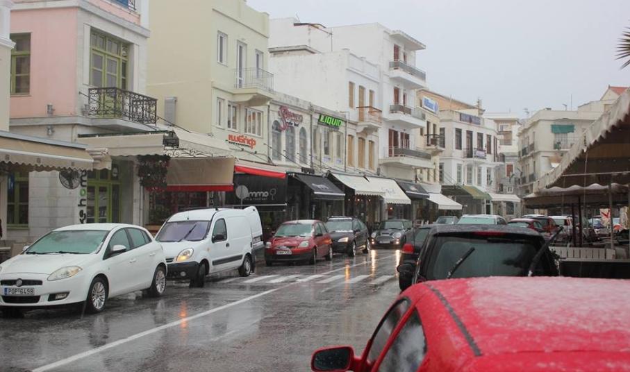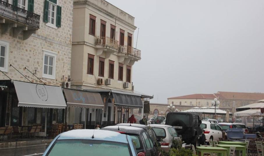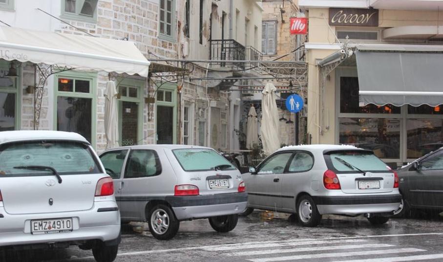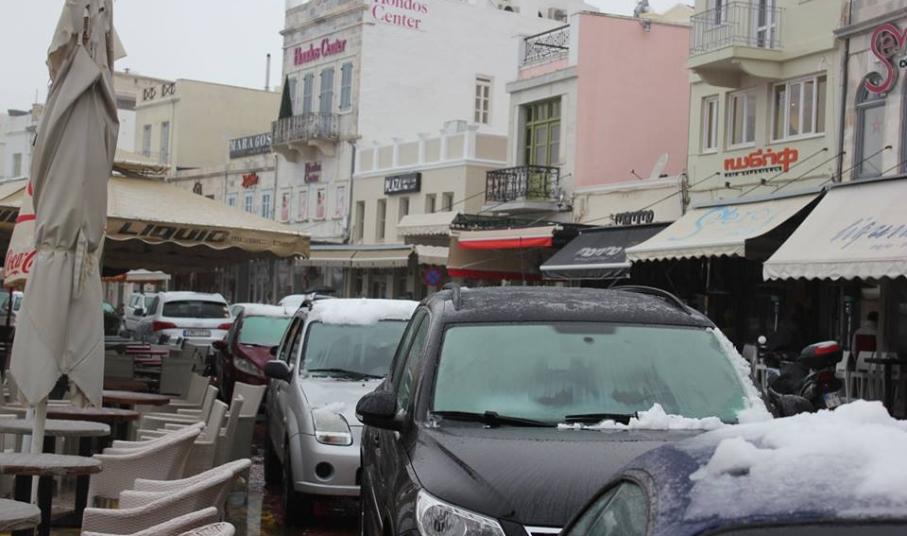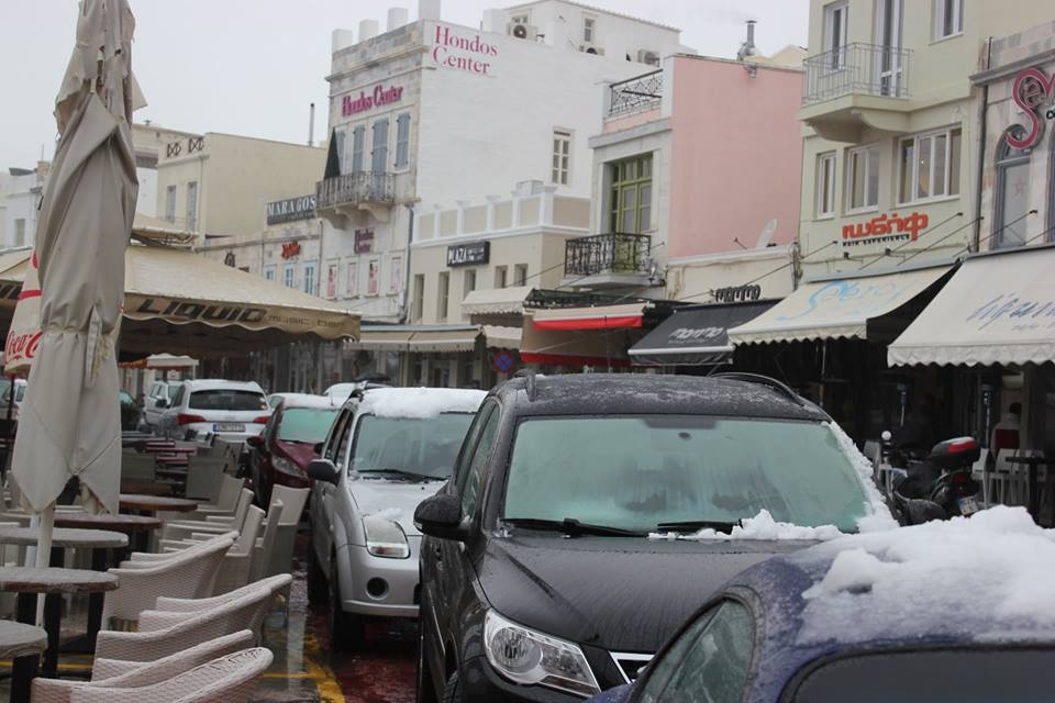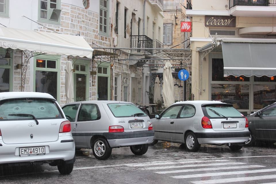 Κατά τη διάρκεια της έντονης χιονόπτωσης το βράδυ της Τρίτης, μεγάλος ήταν ο αριθμός των σταθμευμένων οχημάτων μπροστά και έναντι των καταστημάτων στην παραλιακή οδό της Ερμούπολης. Εκτός από την ουρά των αυτοκινήτων, η οποία ξεκινούσε από το άγαλμα της Εθνικής Αντίστασης και κατέληγε στην πλατεία Κανάρη, δεν έλειψαν και οι οδηγοί που για μερικά μόνο εκατοστά δεν πάρκαραν τα οχήματά τους μέσα στην καφετέρια, την οποία επισκέφτηκαν.